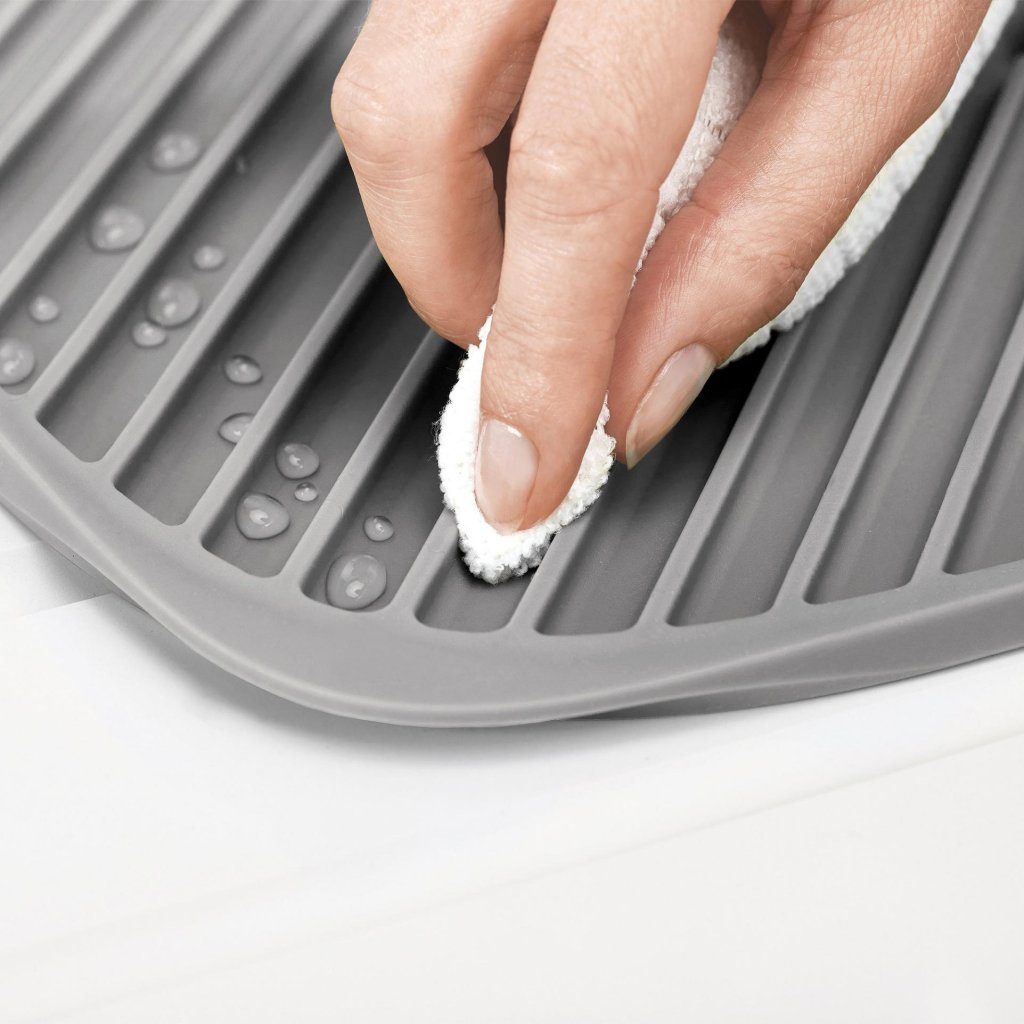 - Het compacte ontwerp maakt het mogelijk om de mat naast de gootsteen of op een kleiner werkblad te plaatsen zonder de kookruimte te beperken.