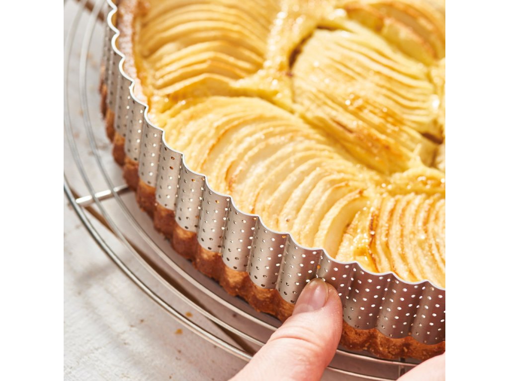 - dankzij het geperforeerde oppervlak wordt het deeg over de hele omtrek gelijkmatig gebakken, zonder natte of rauwe plekken