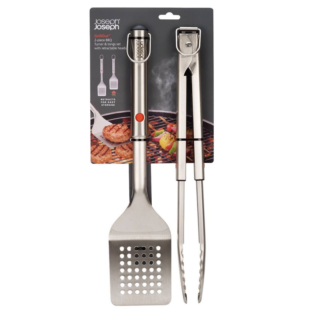 - De grillset Joseph Joseph GRILLOUT bevat een roestvrijstalen tang en een spatel voor het nauwkeurig draaien, vastpakken en serveren van voedsel tijdens het grillen in de buitenlucht.