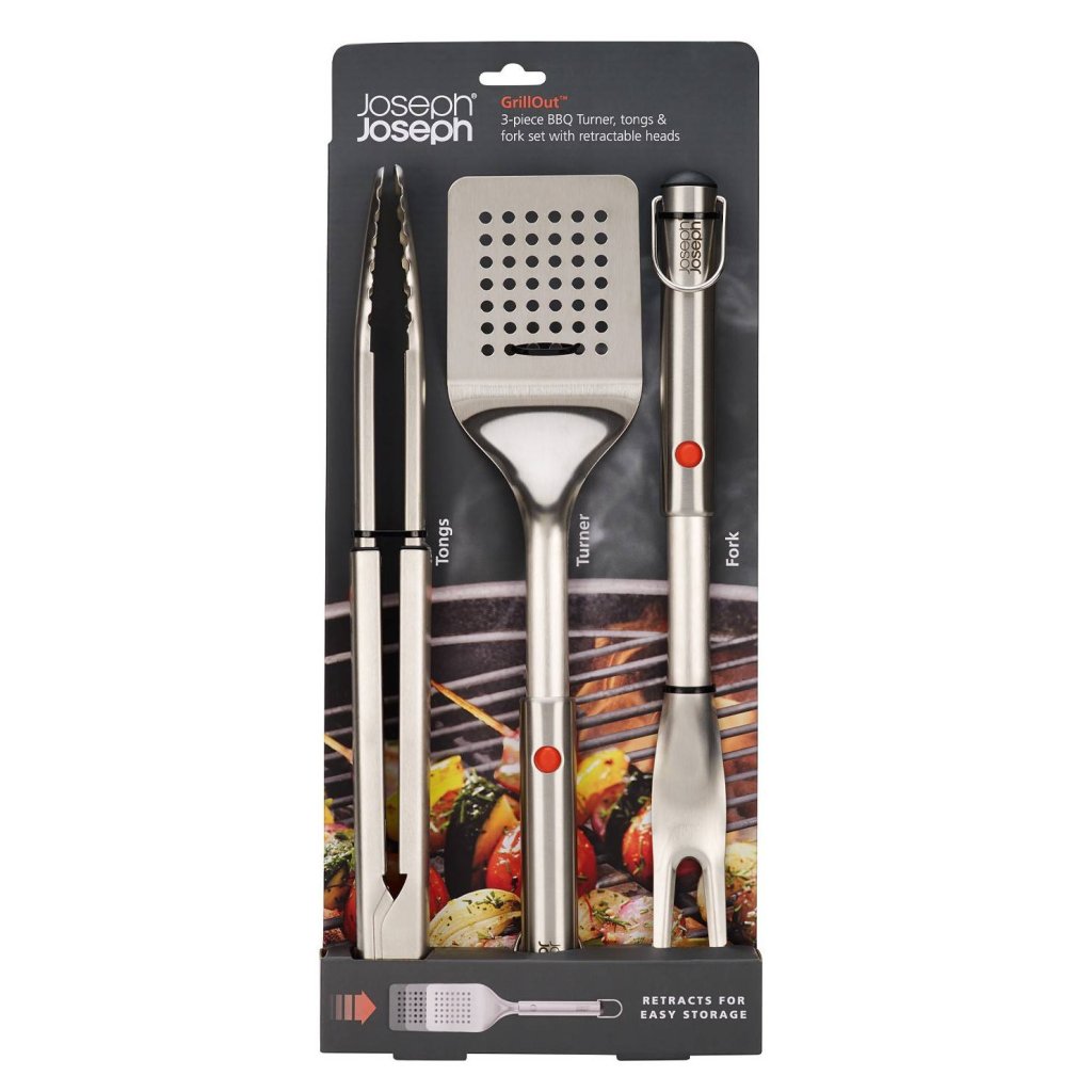 - De grillset Joseph Joseph GRILLOUT bevat een vork, een spatel en roestvrijstalen tangen voor complete voedselverwerking tijdens het barbecueën in de buitenlucht.