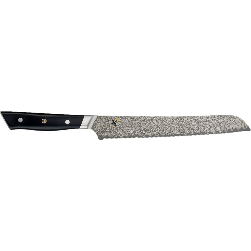 Messen uit de MIYABI Hibana serie hebben 49 lagen damascus staal op het lemmet , die een uniek en onherhaalbaar patroon vormen, genaamd "Spark". De kern is gemaakt van FC61 Friodur staal met een hardheid van 61 Rockwell graden (HRC). Het drievoudig geklonken handvat heeft een ergonomische vorm die uiterst comfortabel is om het mes vast te pakken en te leiden tijdens het snijden. Elegante zwarte en messing afstandhouders op het heft versterken de schoonheid van het mes, de stevige grip en de goede wendbaarheid aan de punt. Dit broodmes met een lemmetlengte van 24 cm maakt ook deel uit van het assortiment.