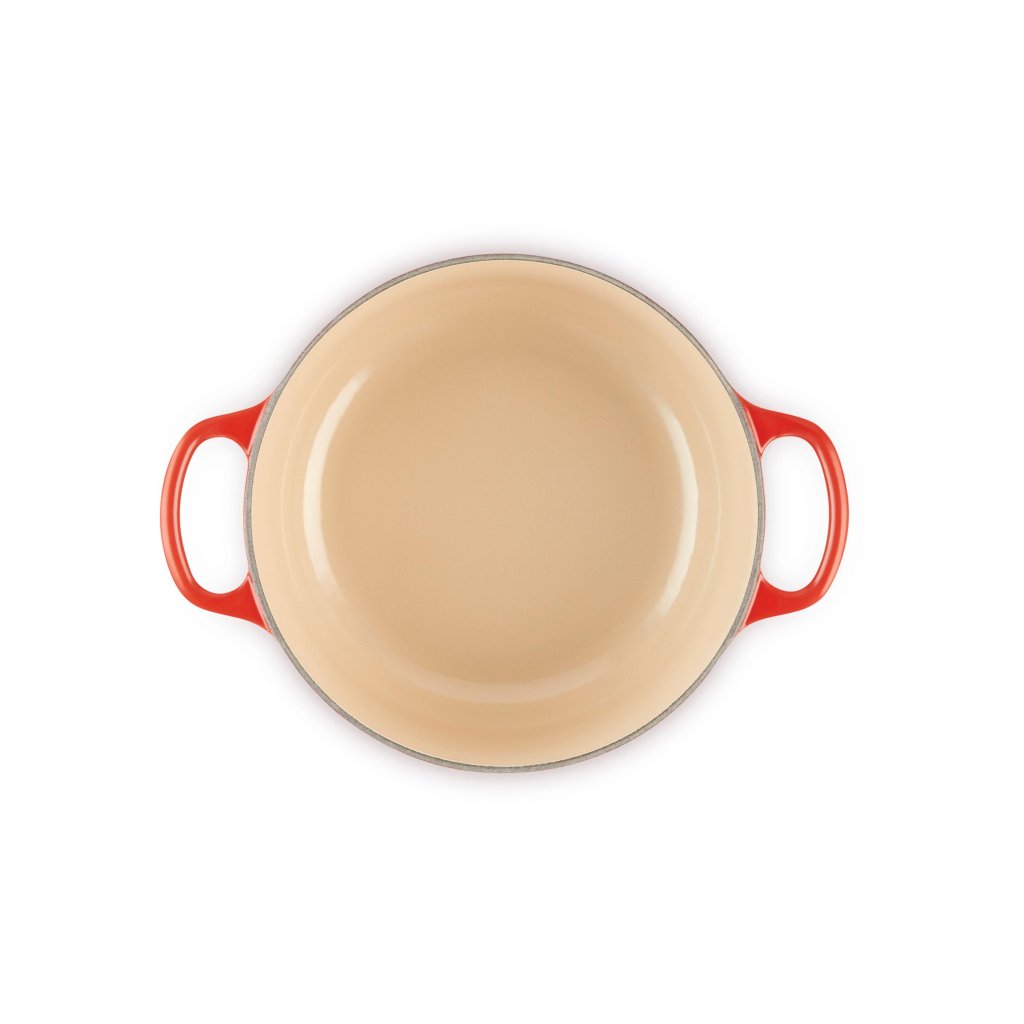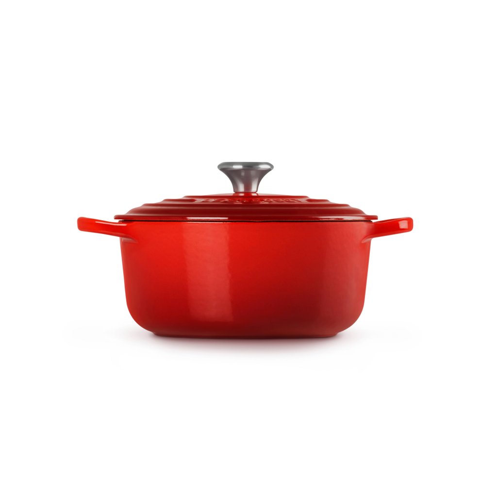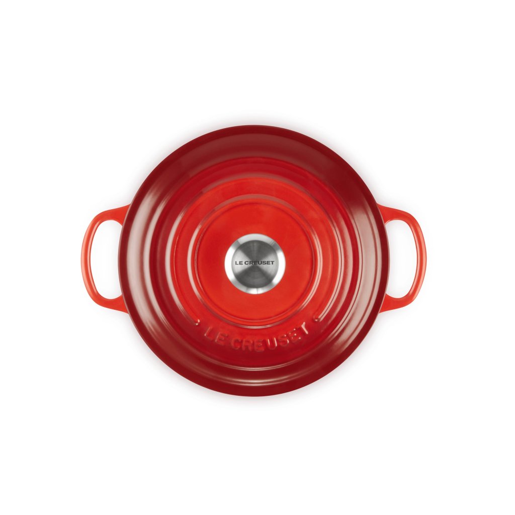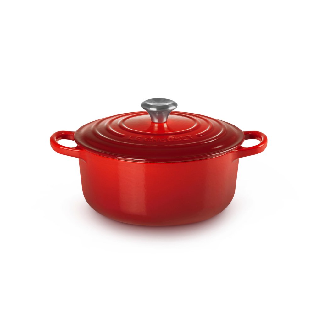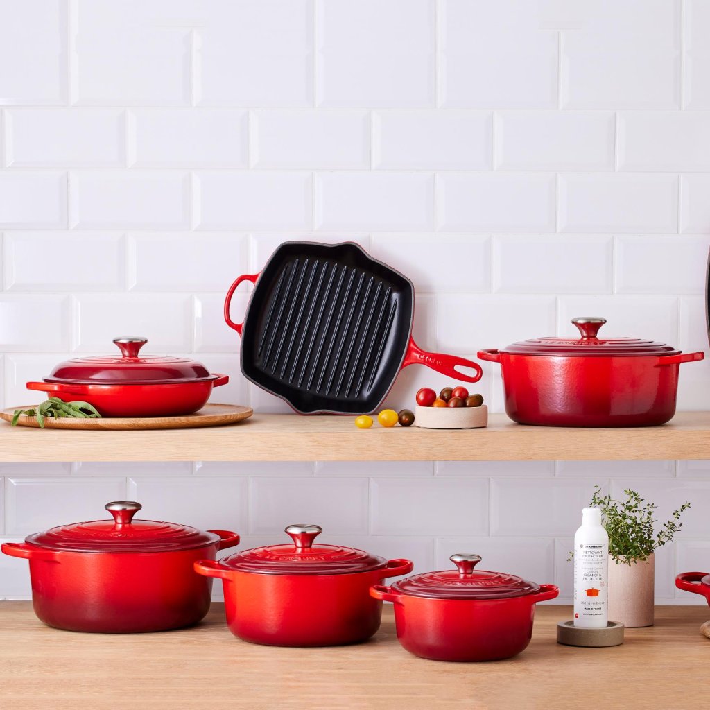 - Het iconische gietijzeren exemplaar casserole pan Le Creuset in de kleur CERISE is een culinaire klassieker die al meer dan een eeuw keukens over de hele wereld verrijkt.