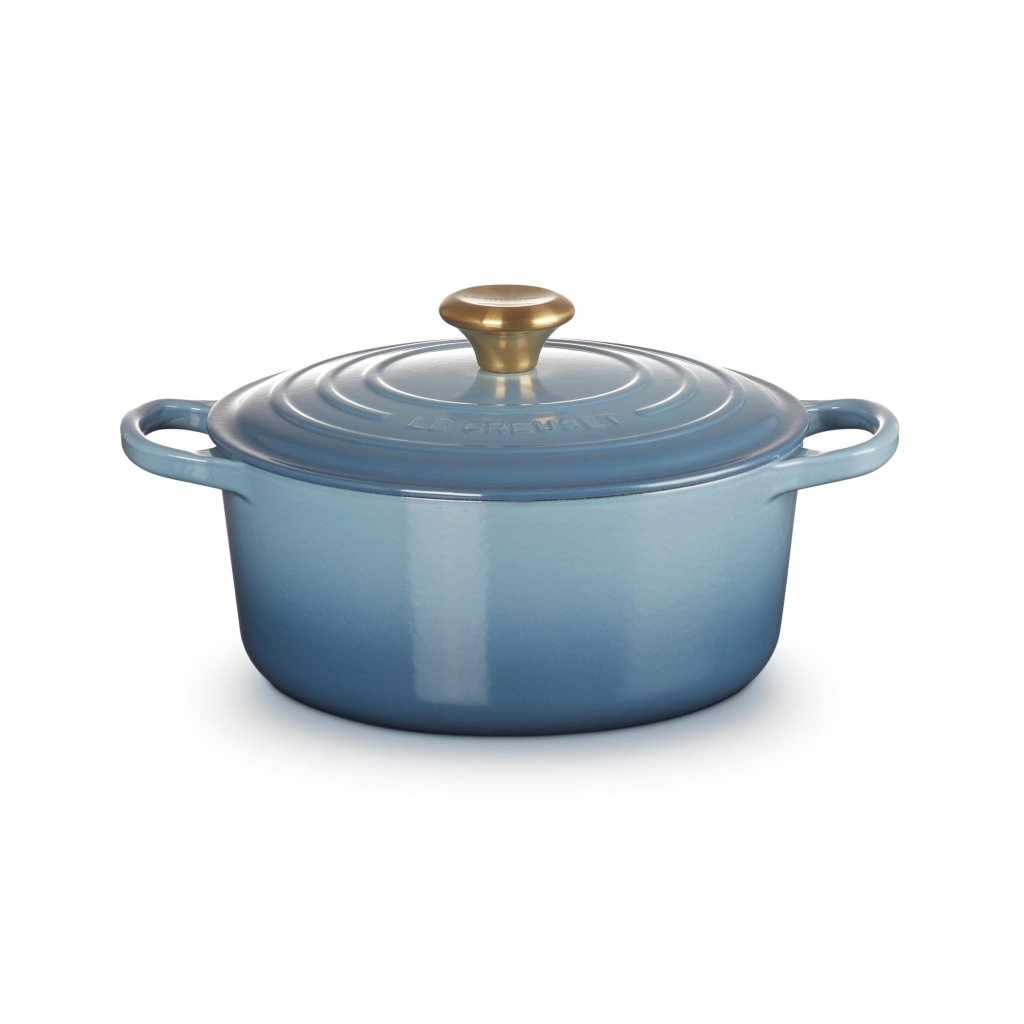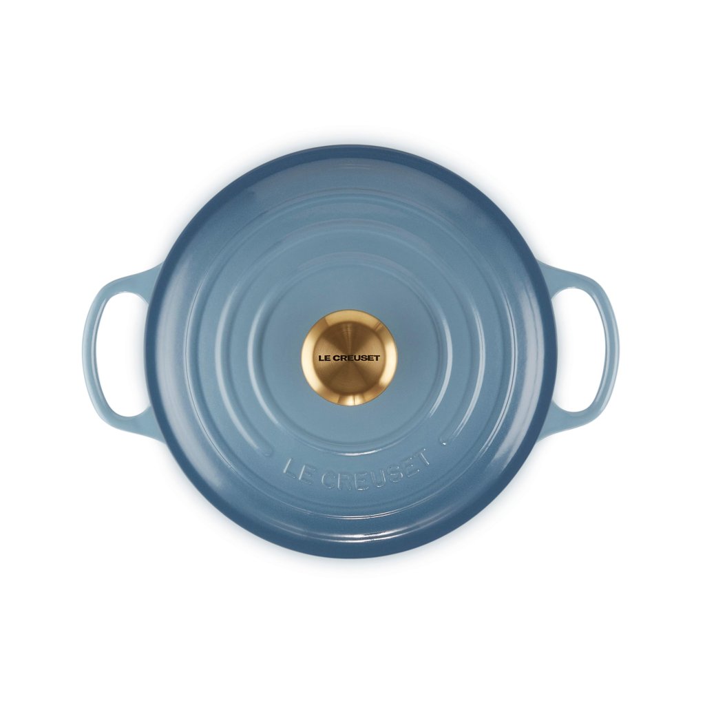 - De elegante lichtblauwe kleur CHAMBRAY met het gouden handvat geeft de pan een delicate en stijlvolle uitstraling die uw keuken en tafel zal sieren.
