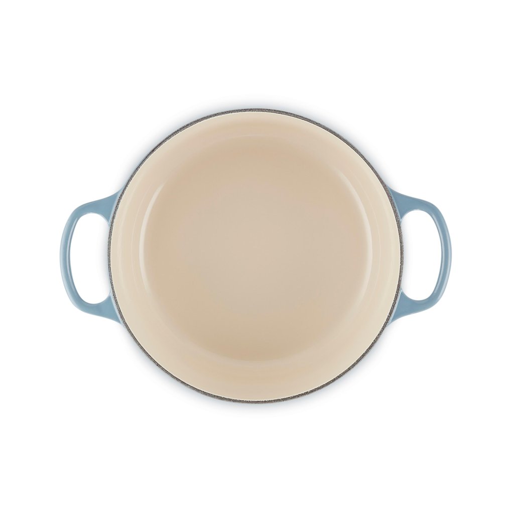 - Het iconische gietijzeren exemplaar casserole pan Le Creuset in de kleur CHAMBRAY is een culinaire klassieker die al meer dan een eeuw keukens over de hele wereld verrijkt.