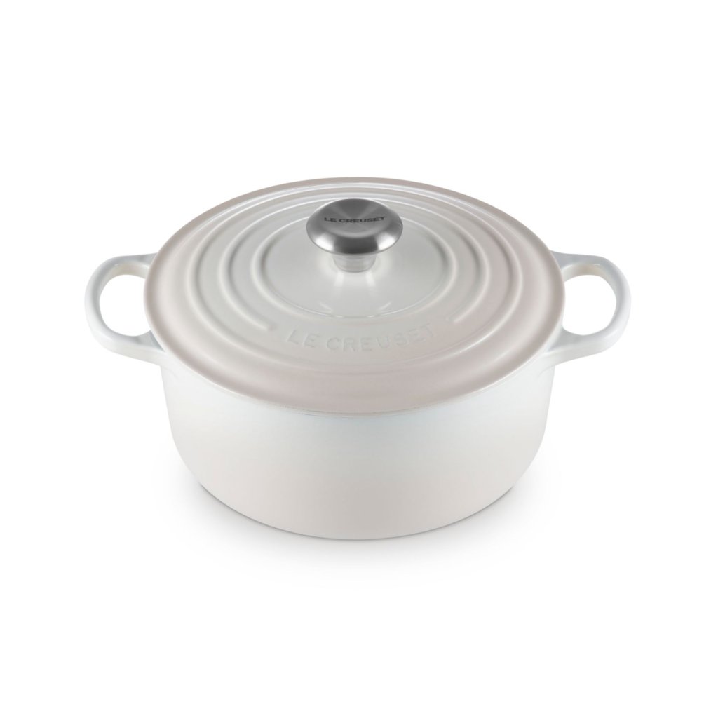- Het iconische gietijzeren exemplaar casserole pan Le Creuset in de kleur MERINGUE is een culinaire klassieker die al meer dan een eeuw keukens over de hele wereld verrijkt.
