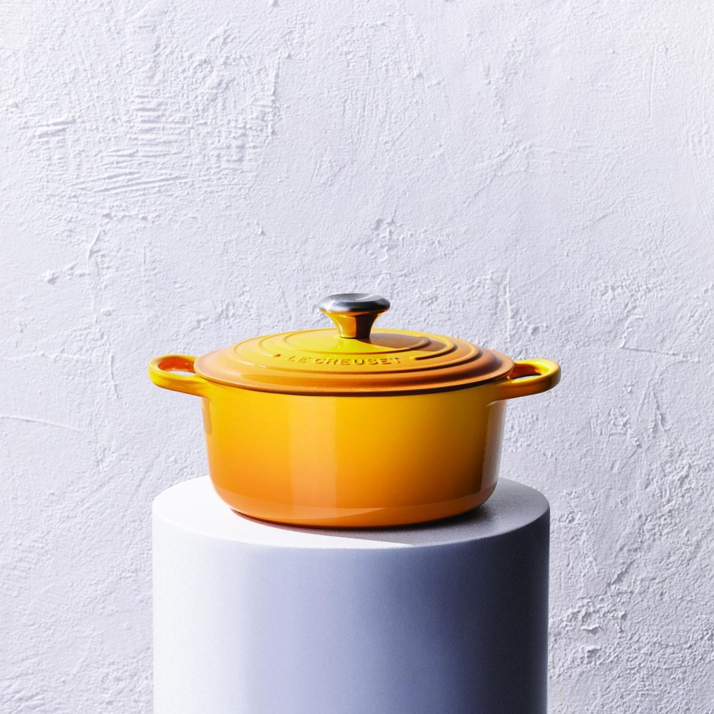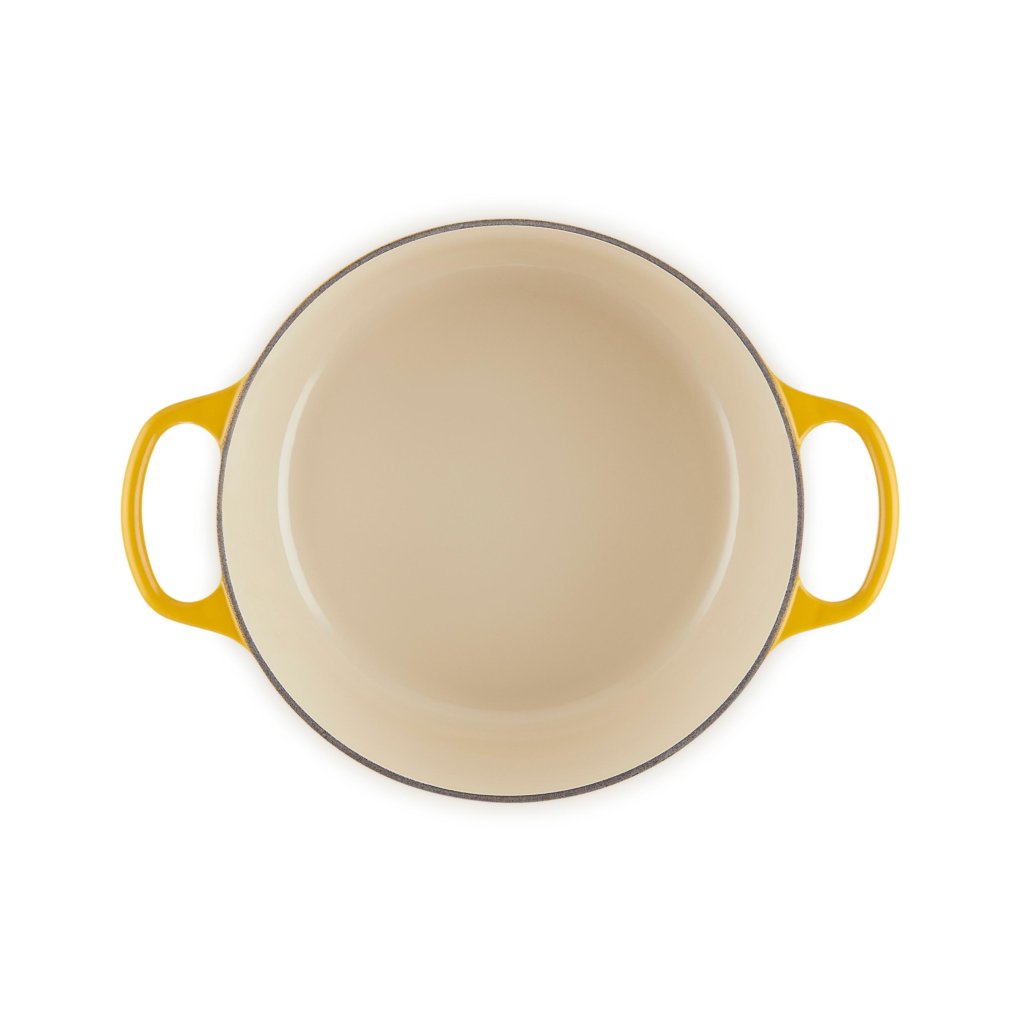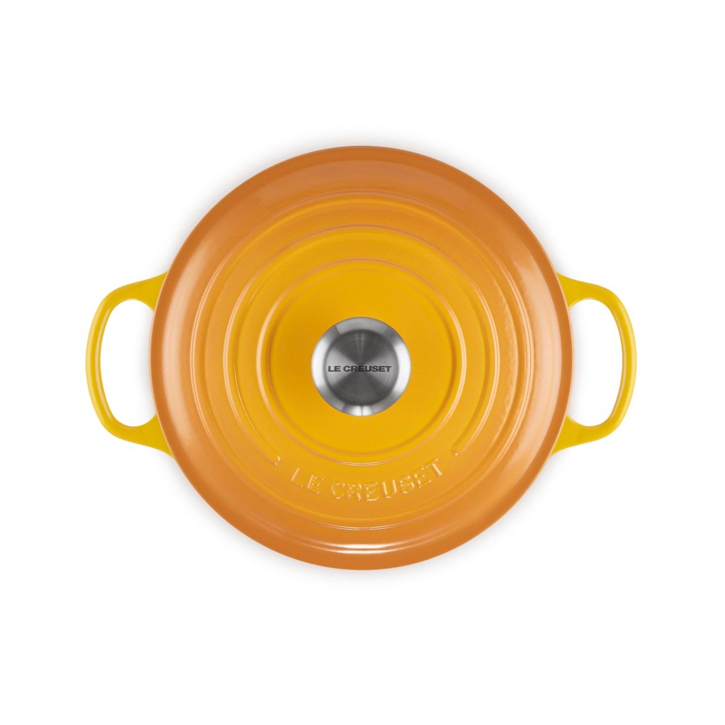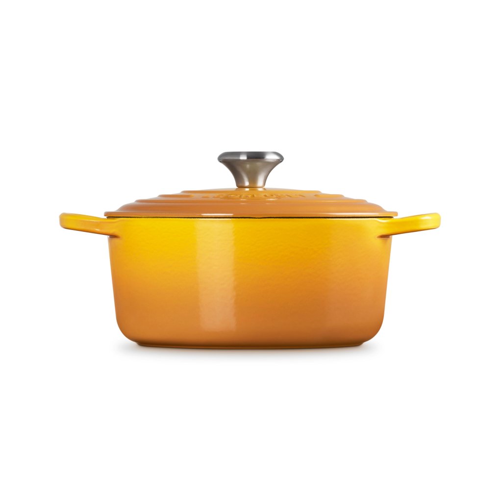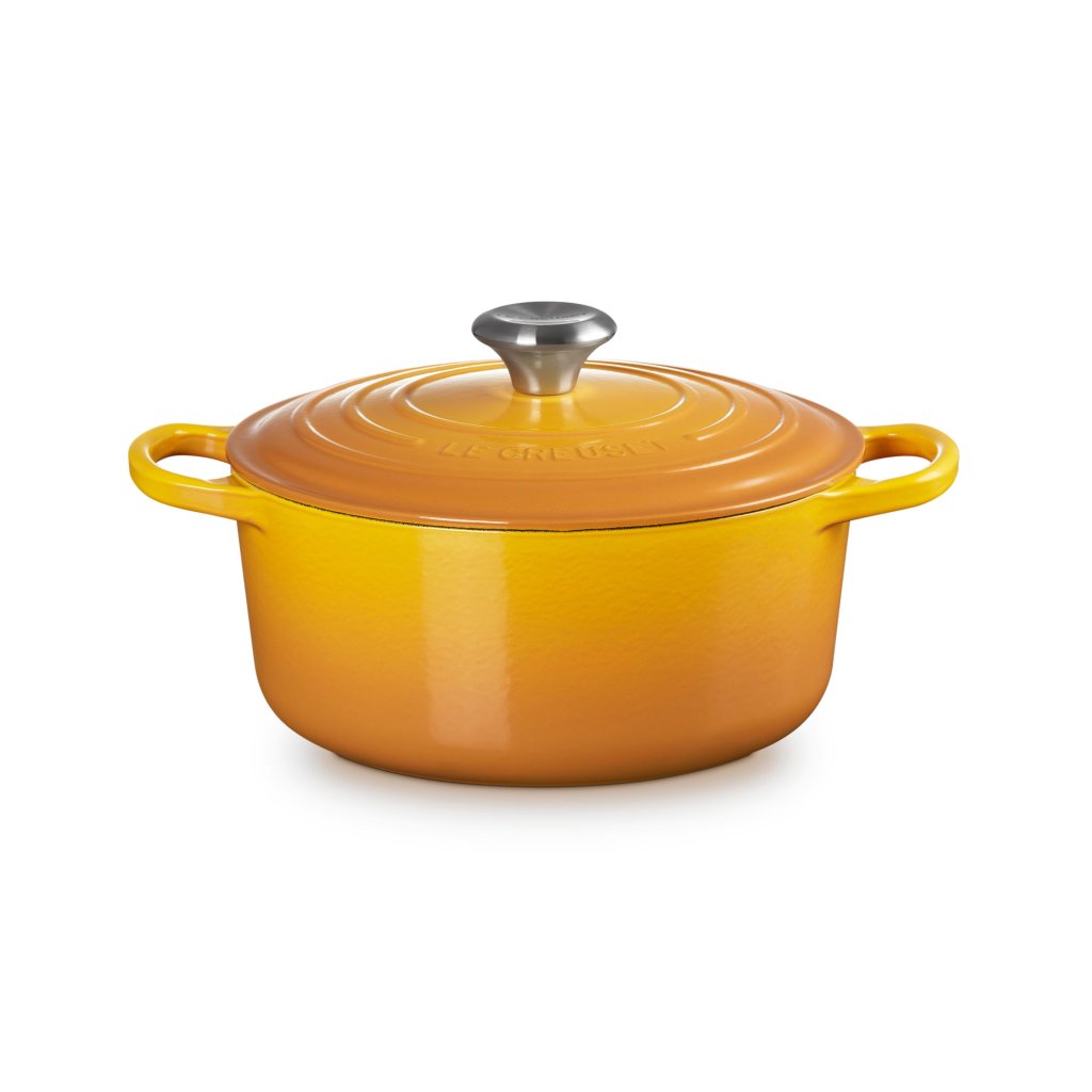 - Het iconische gietijzeren exemplaar casserole pan Le Creuset in de kleur NECTAR is een culinaire klassieker die al meer dan een eeuw keukens over de hele wereld verrijkt.