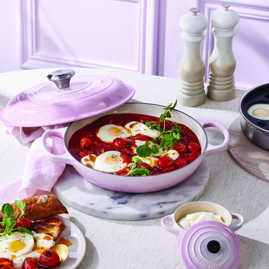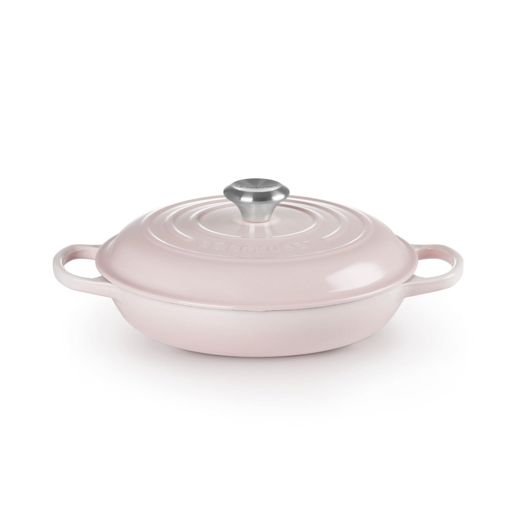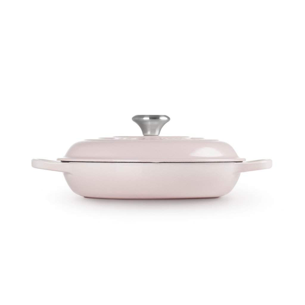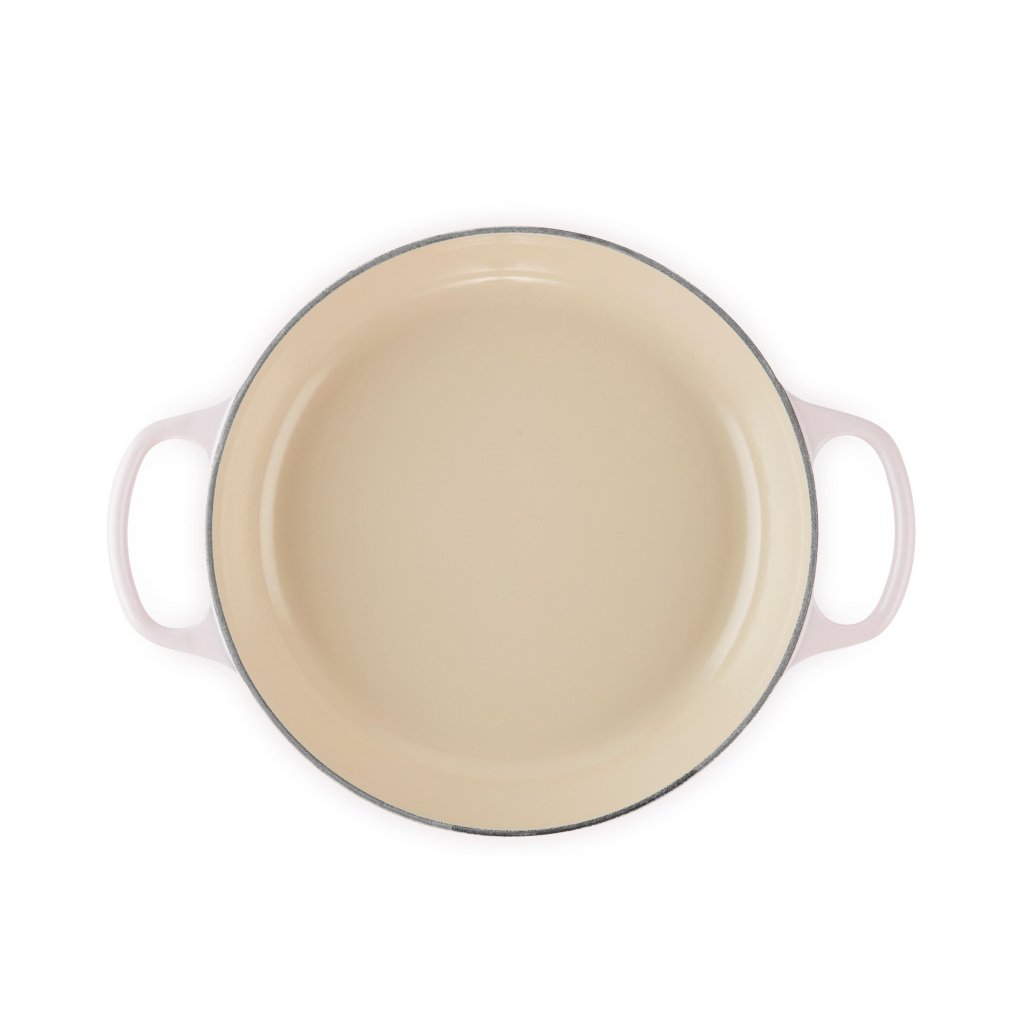 - De platte gietijzeren pan casserole pan Le Creuset in de kleur SHELL PINK wordt in Frankrijk gemaakt en is een van de legendarische exemplaren van het merk, ideaal om te stoven, braden, bakken en stoven voor 2 - 4 personen.