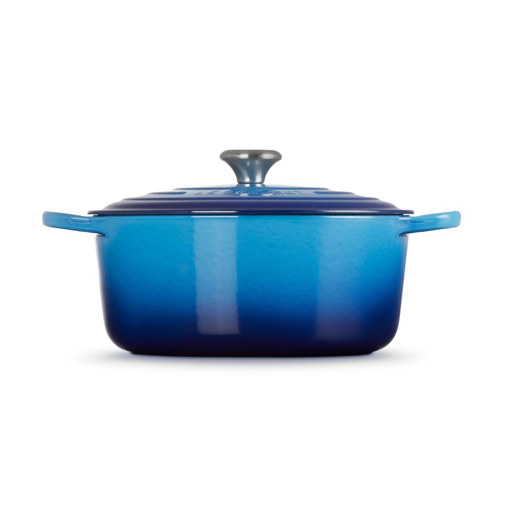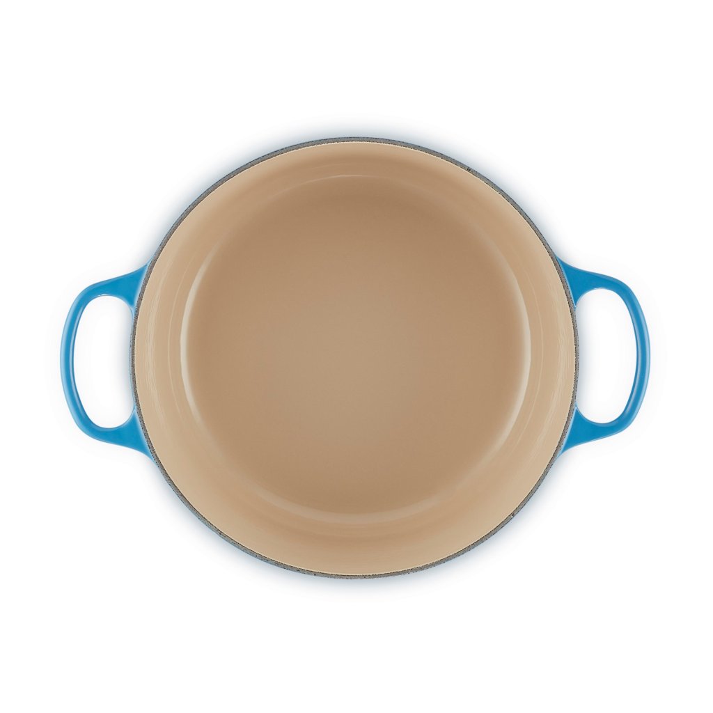 - De iconische gietijzeren pan casserole pan Le Creuset in de kleur AZURE is een icoon onder de keukengerei, populair over de hele wereld en ideaal voor het bereiden van soepen, stoofschotels, gebraden vlees en ovenspecialiteiten.