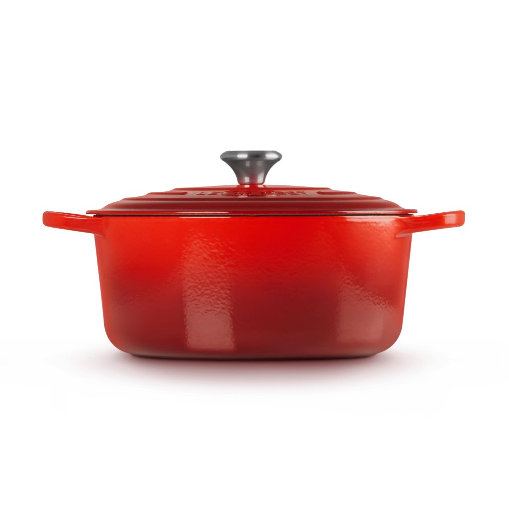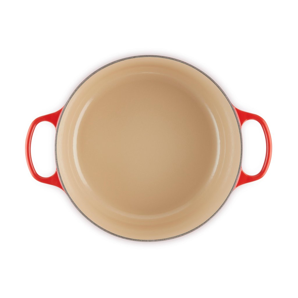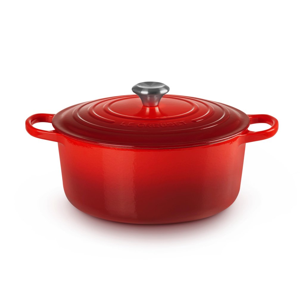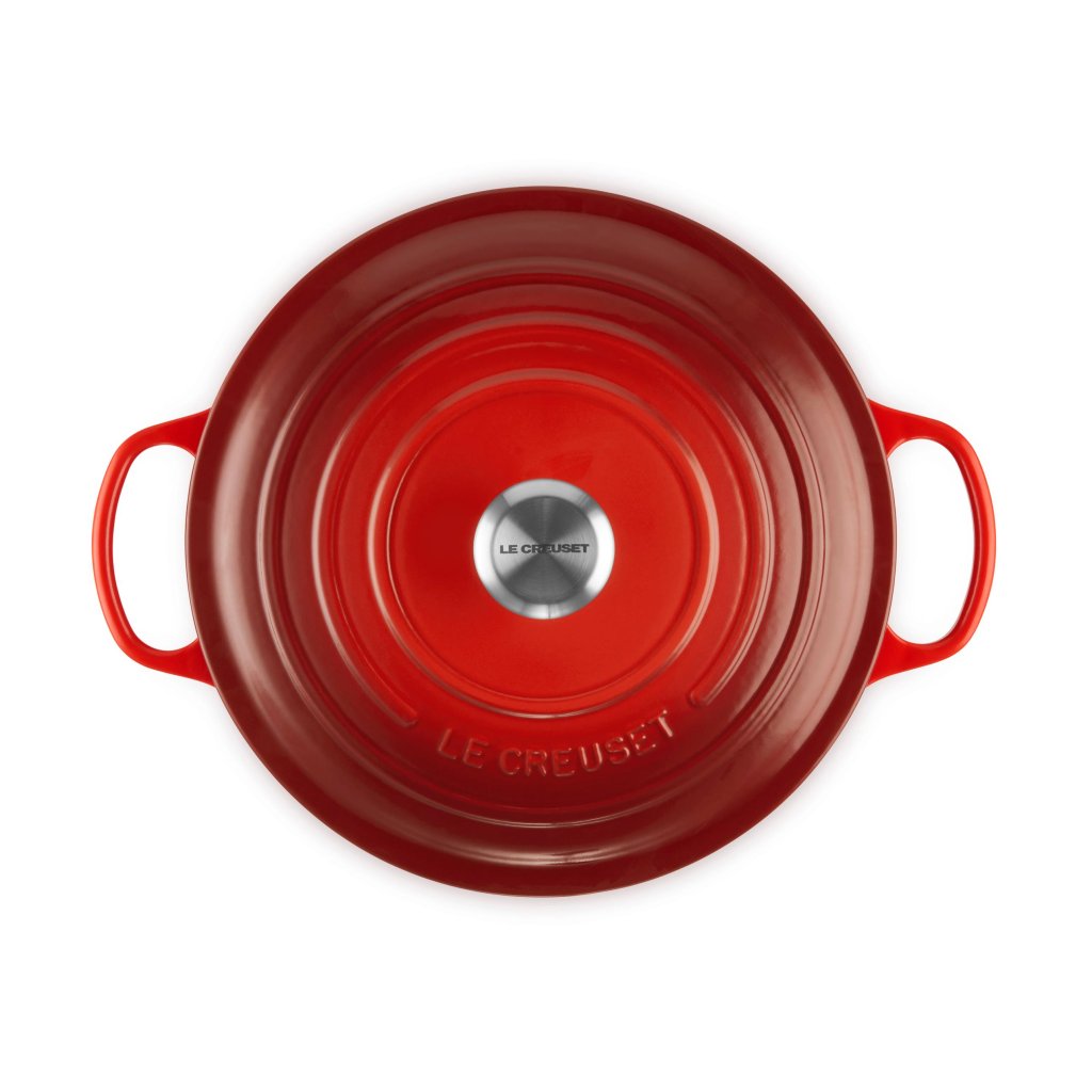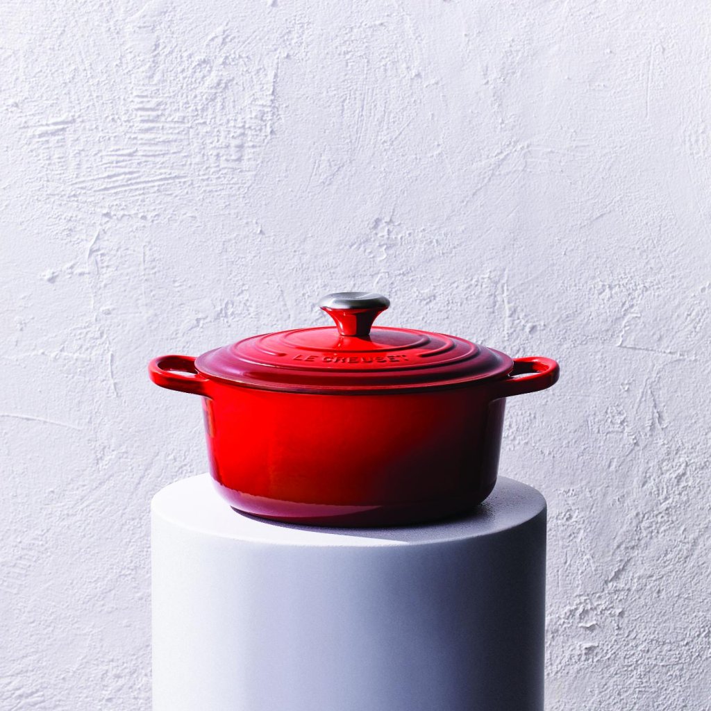 - Het iconische gietijzeren exemplaar casserole pan Le Creuset in de kleur CERISE is een icoon onder de keukenbenodigdheden, populair over de hele wereld en ideaal voor het bereiden van soepen, stoofschotels, gebraden vlees en ovenspecialiteiten.