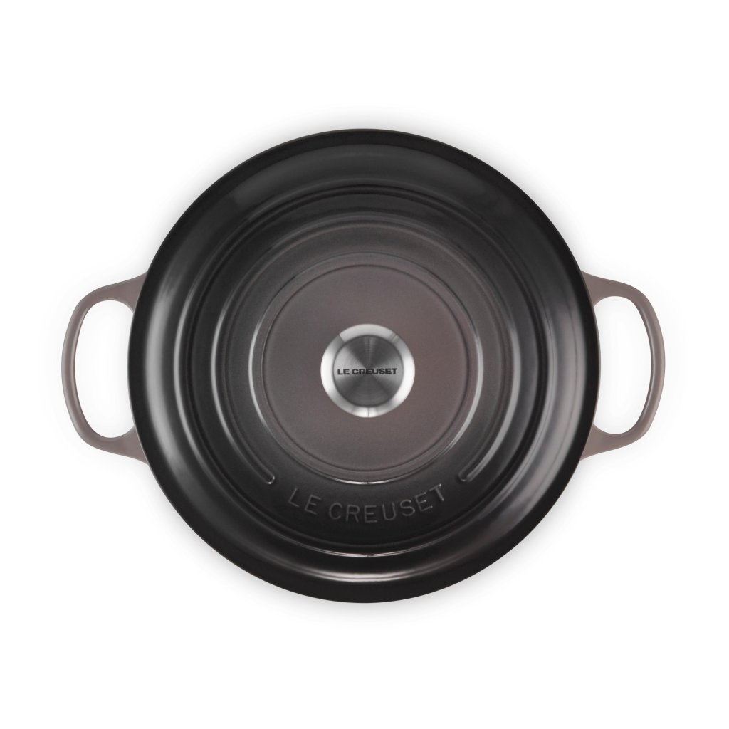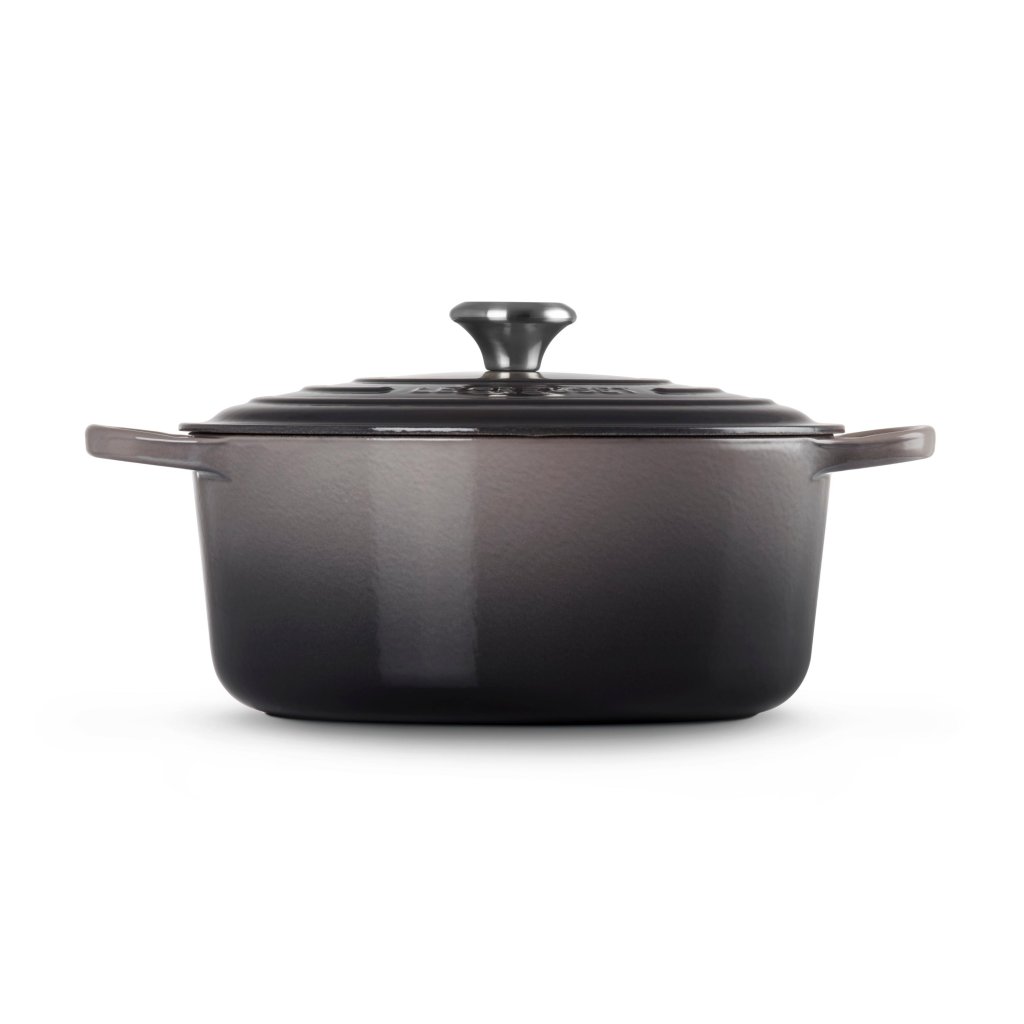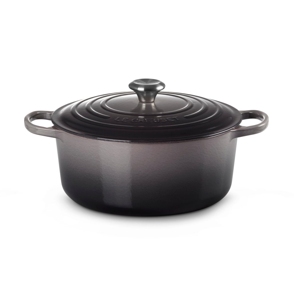 - Het iconische gietijzeren exemplaar casserole pan Le Creuset in de kleur FLINT is een icoon onder de keukenbenodigdheden, populair over de hele wereld en ideaal voor het bereiden van soepen, stoofschotels, gebraden vlees en ovenspecialiteiten.