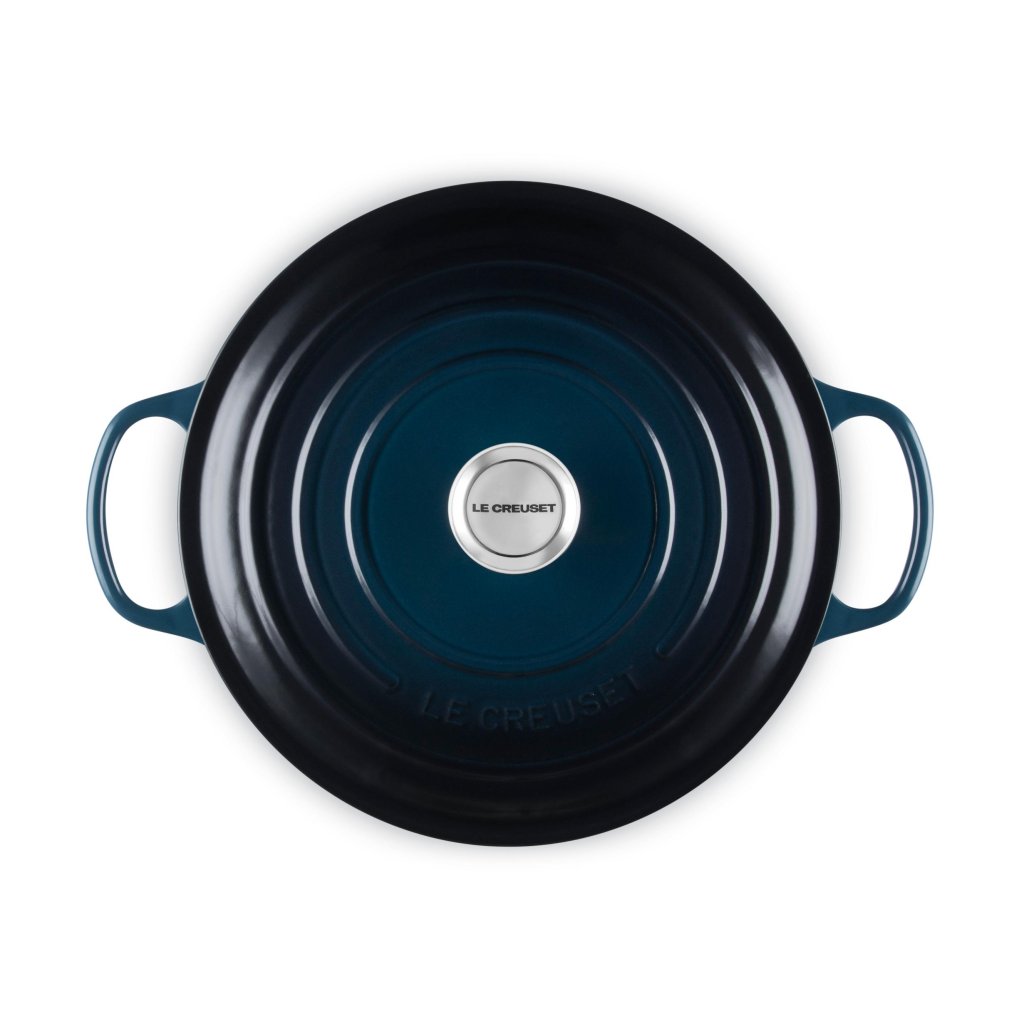 - Het iconische gietijzeren exemplaar casserole pan Le Creuset in de kleur NUIT is een icoon onder de keukenbenodigdheden, populair over de hele wereld en ideaal voor het bereiden van soepen, stoofschotels, gebraden vlees en ovenspecialiteiten.