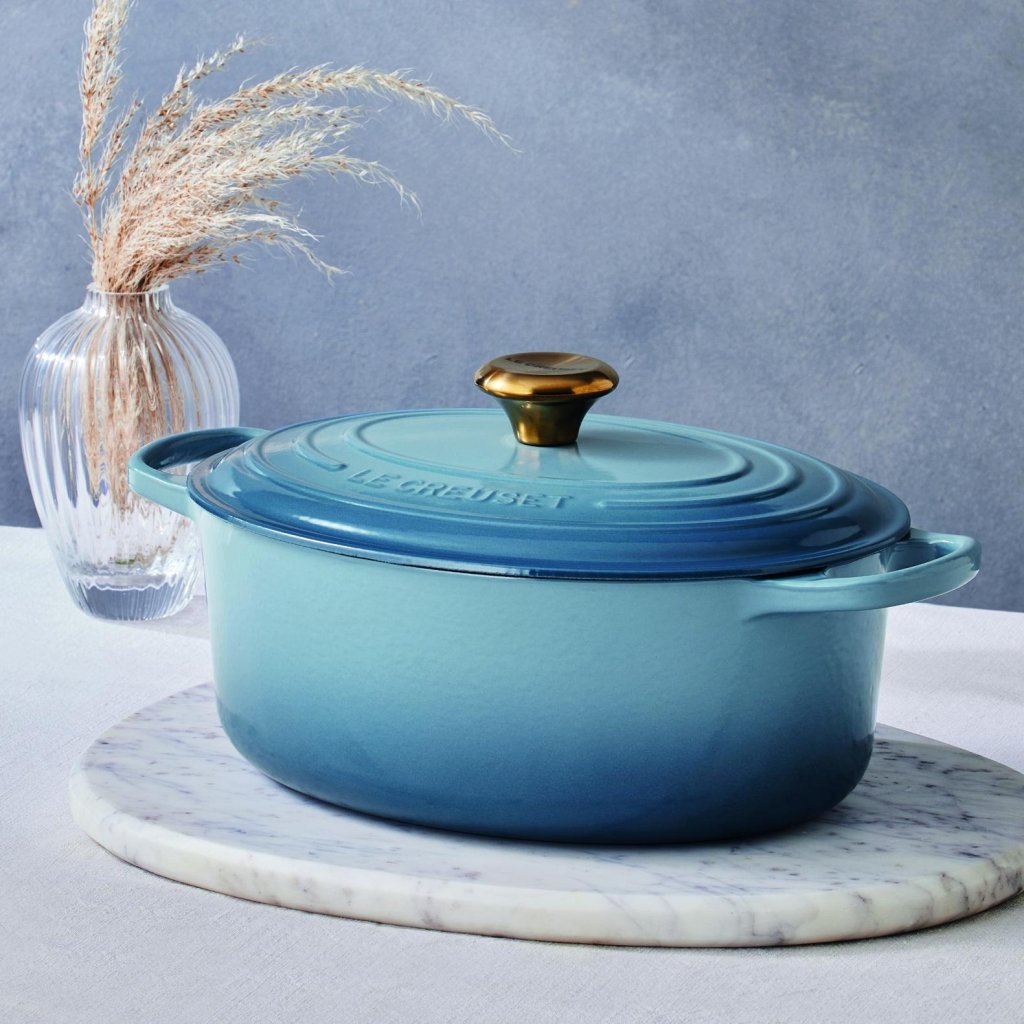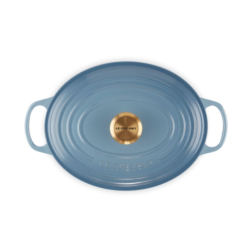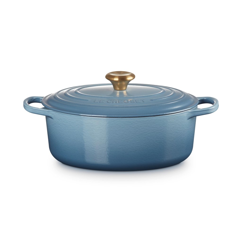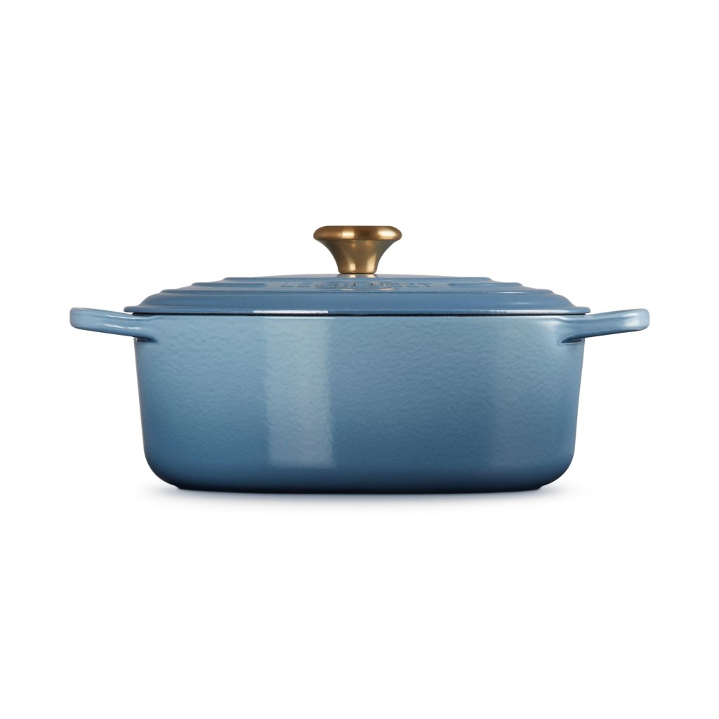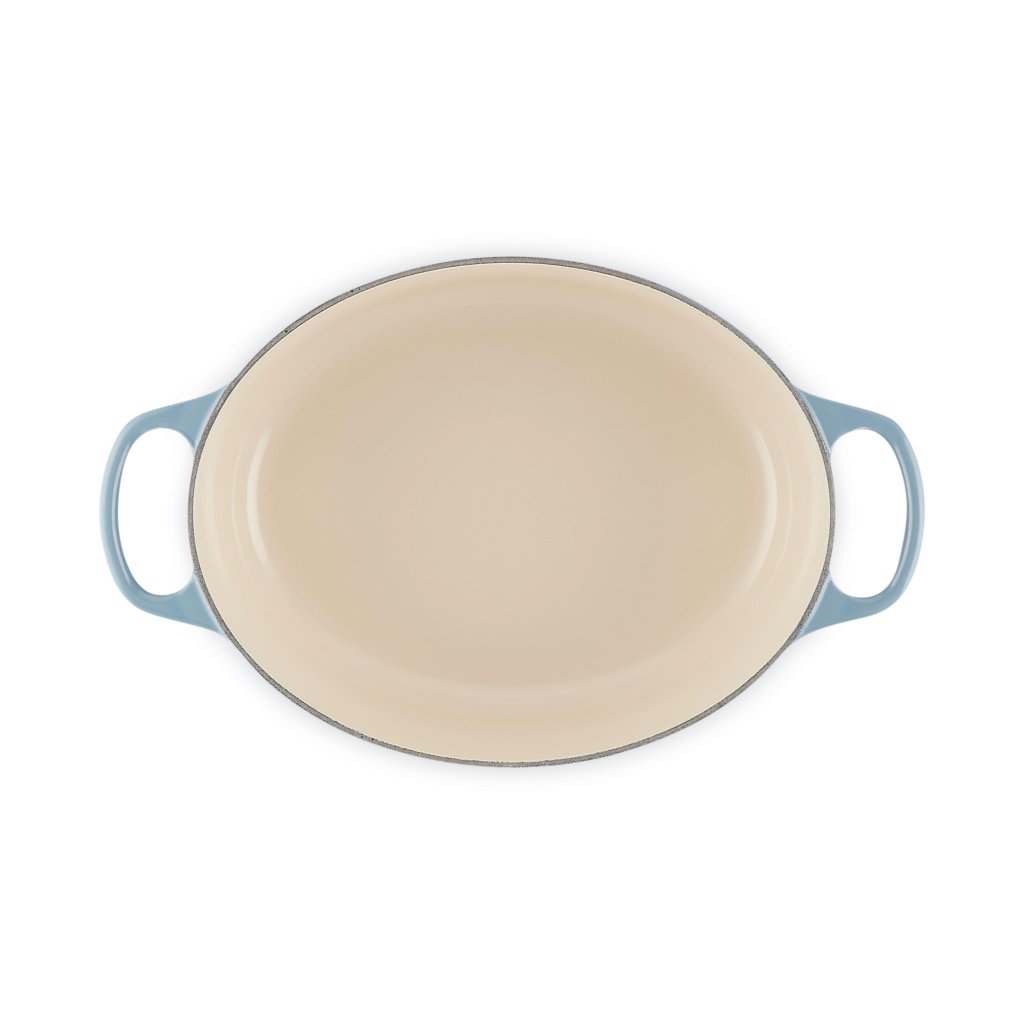 - De ovale gietijzeren pan casserole pan Le Creuset in de kleur CHAMBRAY is een universele keukenhulp die ruim genoeg is om een hele lamsbout in te bakken en tegelijkertijd smal genoeg om in de oven ruimte over te laten voor bijgerechten.