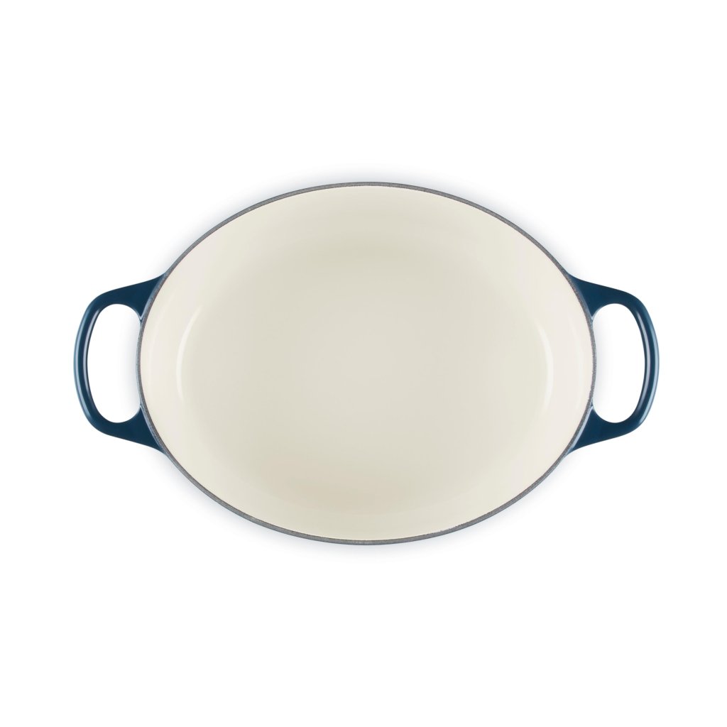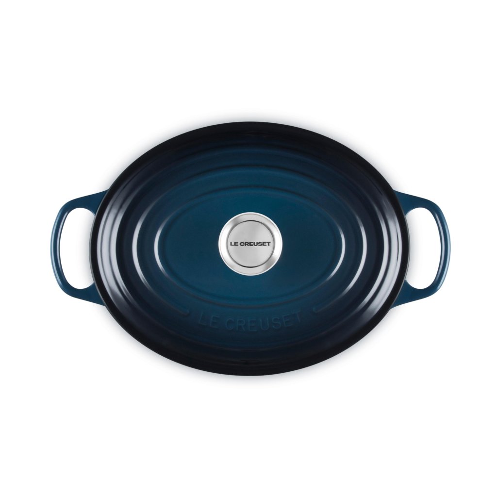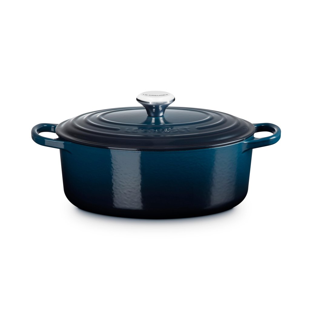- De ovale gietijzeren pan casserole pan Le Creuset in de kleur NUIT is een universele keukenhulp die ruim genoeg is om een hele lamsbout in te bakken en tegelijkertijd smal genoeg om in de oven ruimte over te laten voor bijgerechten.
