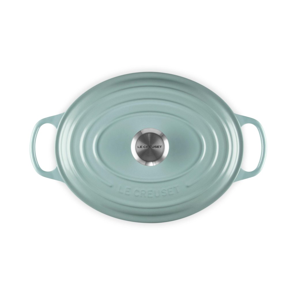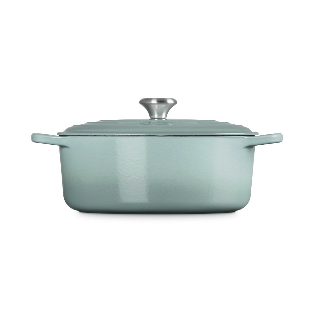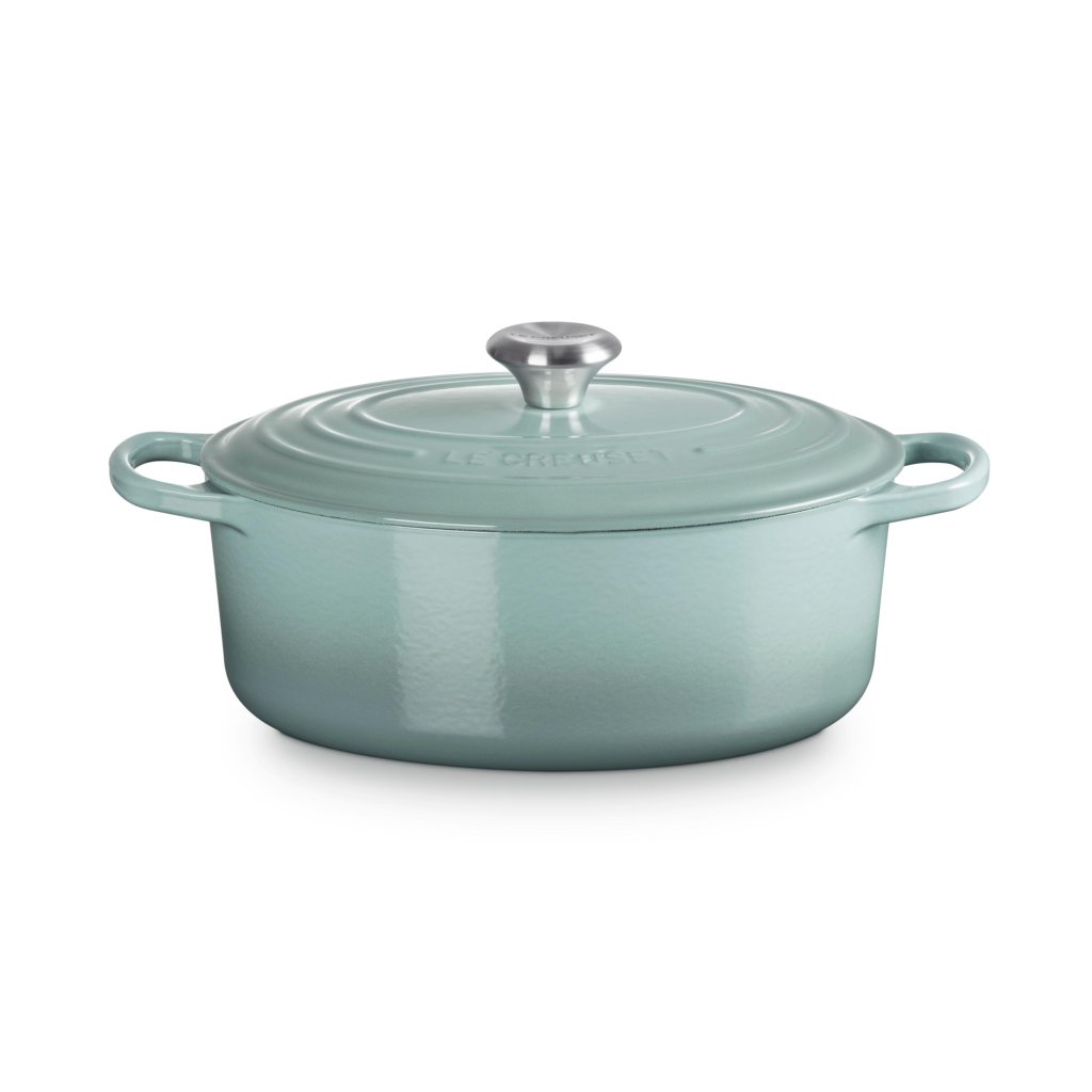- De ovale gietijzeren pan casserole pan Le Creuset in de kleur SEA SALT is een universele keukenhulp die ruim genoeg is om een hele lamsbout in te bakken en tegelijkertijd smal genoeg om in de oven ruimte over te laten voor bijgerechten.