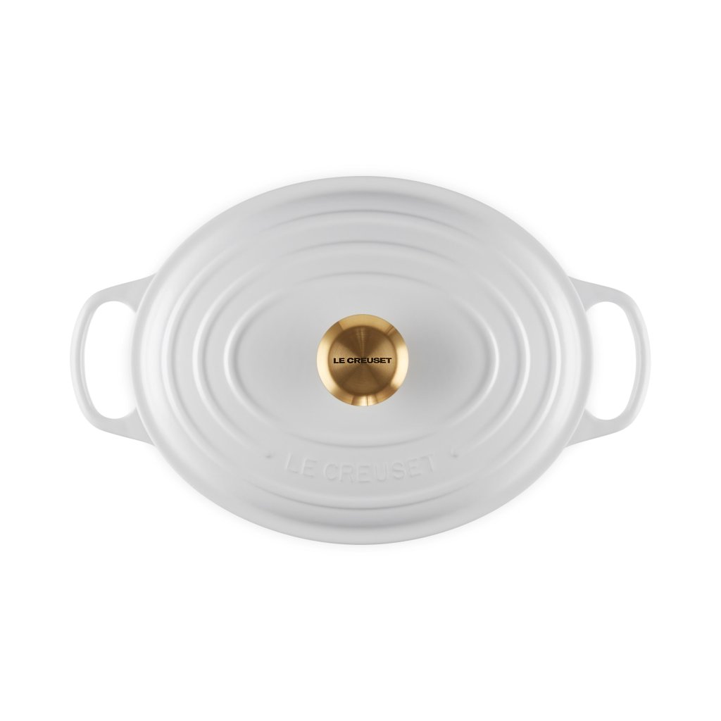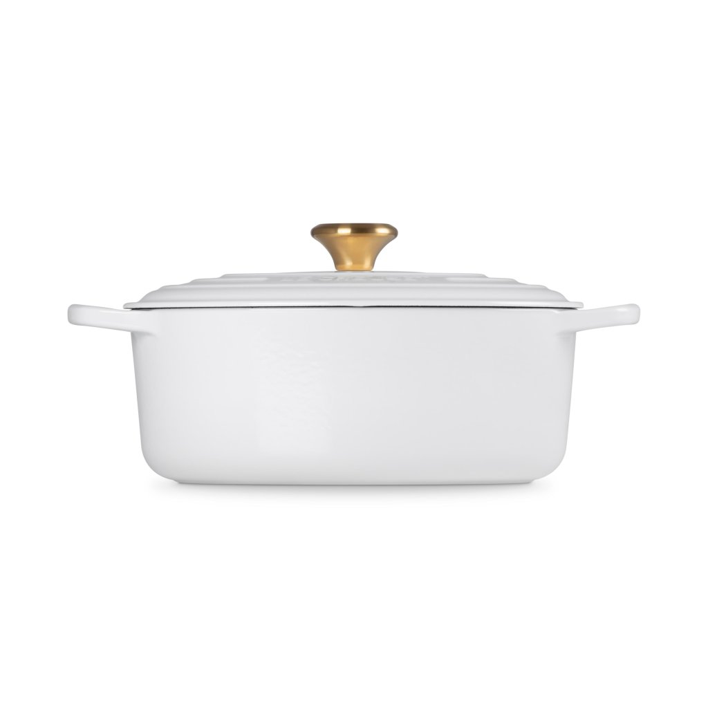 - De ovale gietijzeren pan casserole pan Le Creuset in de kleur WHITE is een universele keukenhulp die ruim genoeg is om een hele lamsbout in te bakken en tegelijkertijd smal genoeg om in de oven ruimte over te laten voor bijgerechten.