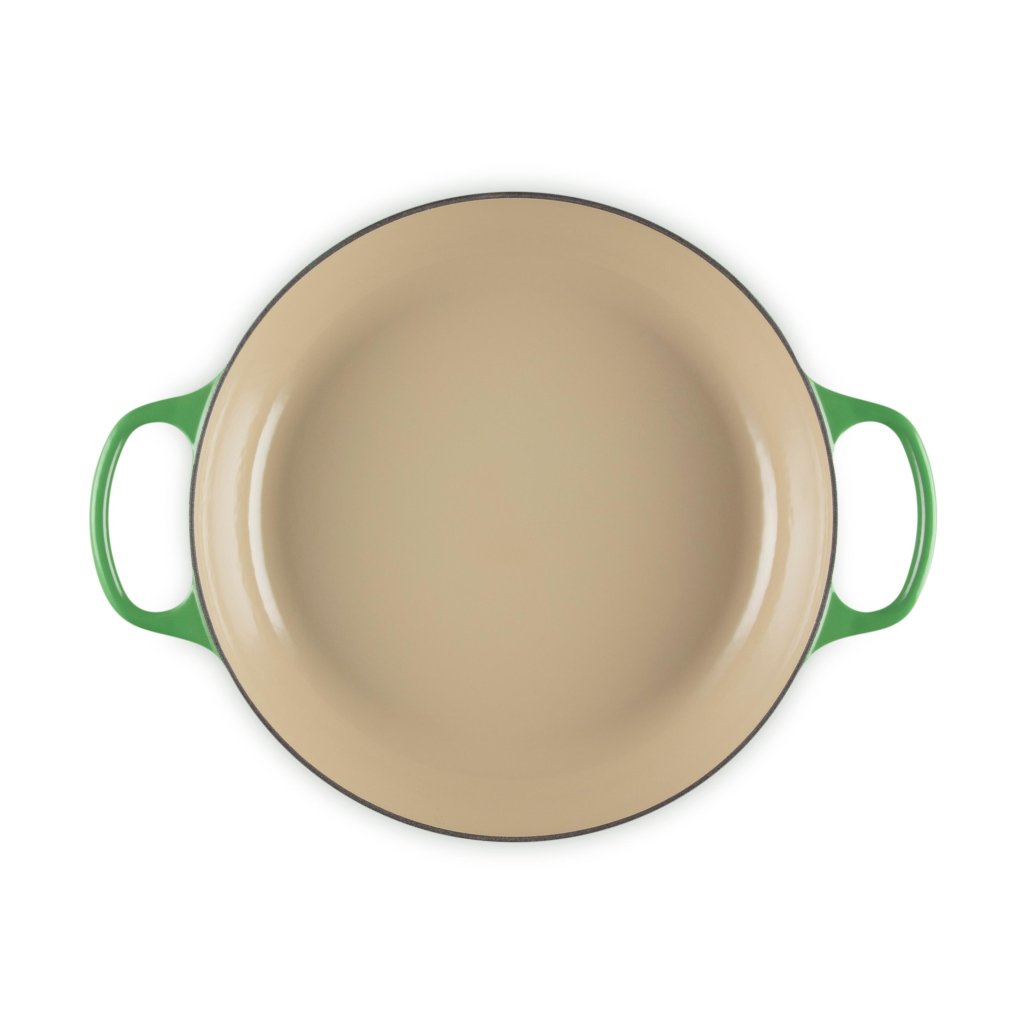 - De platte gietijzeren pan casserole pan Le Creuset in de kleur BAMBOO wordt in Frankrijk gemaakt en is een van de legendarische exemplaren van het merk, ideaal om te stoven, braden, bakken en stoven voor 4 - 6 personen.