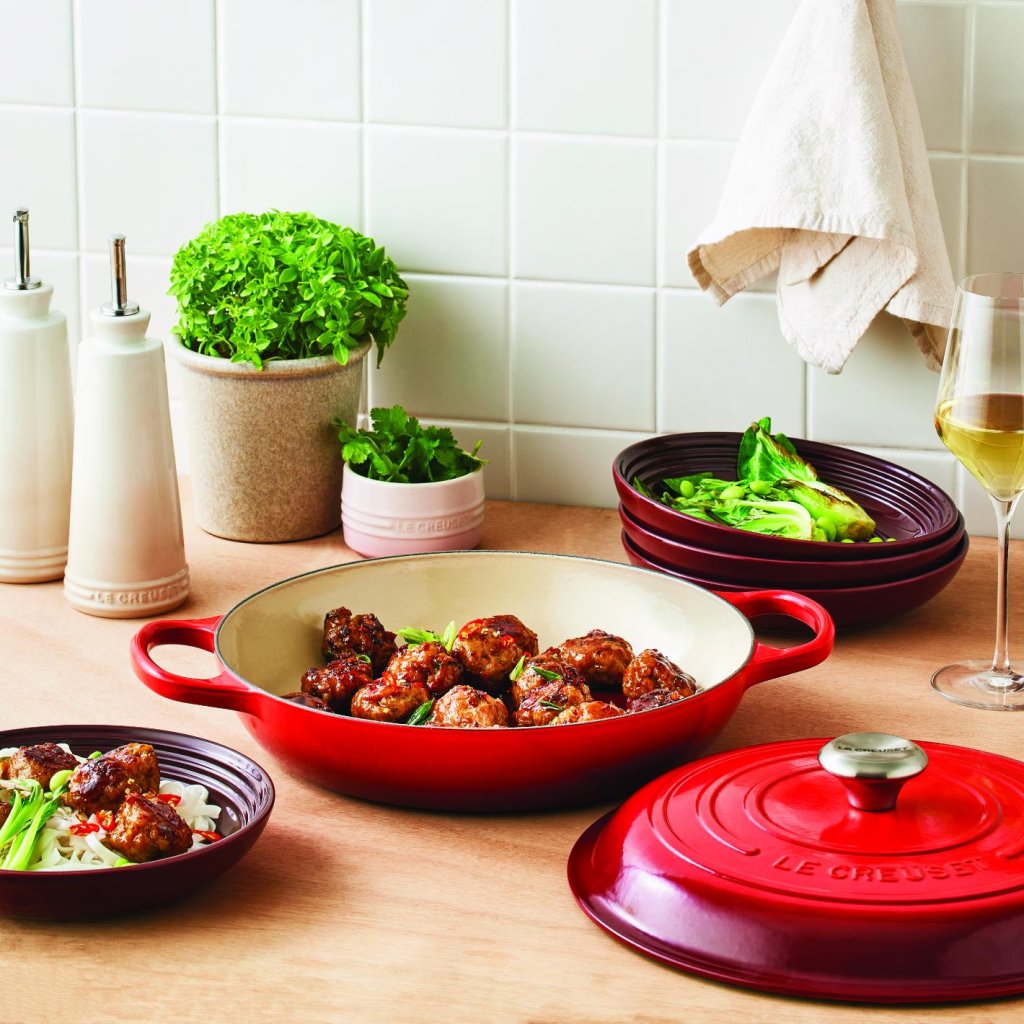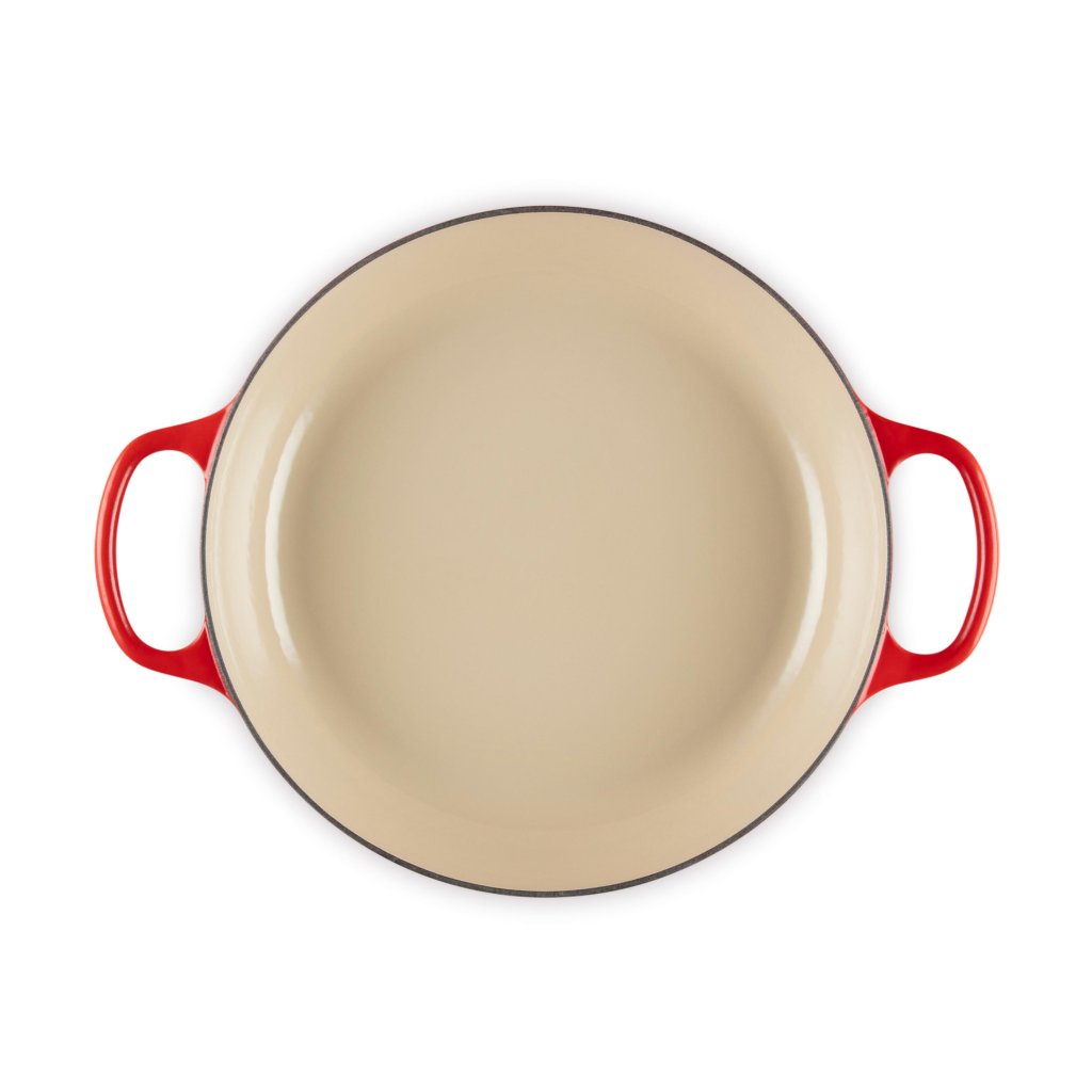 - De platte gietijzeren pan casserole pan Le Creuset in de kleur CERISE wordt in Frankrijk gemaakt en is een van de legendarische exemplaren van het merk, ideaal om te stoven, braden, bakken en stoven voor 4 - 6 personen.