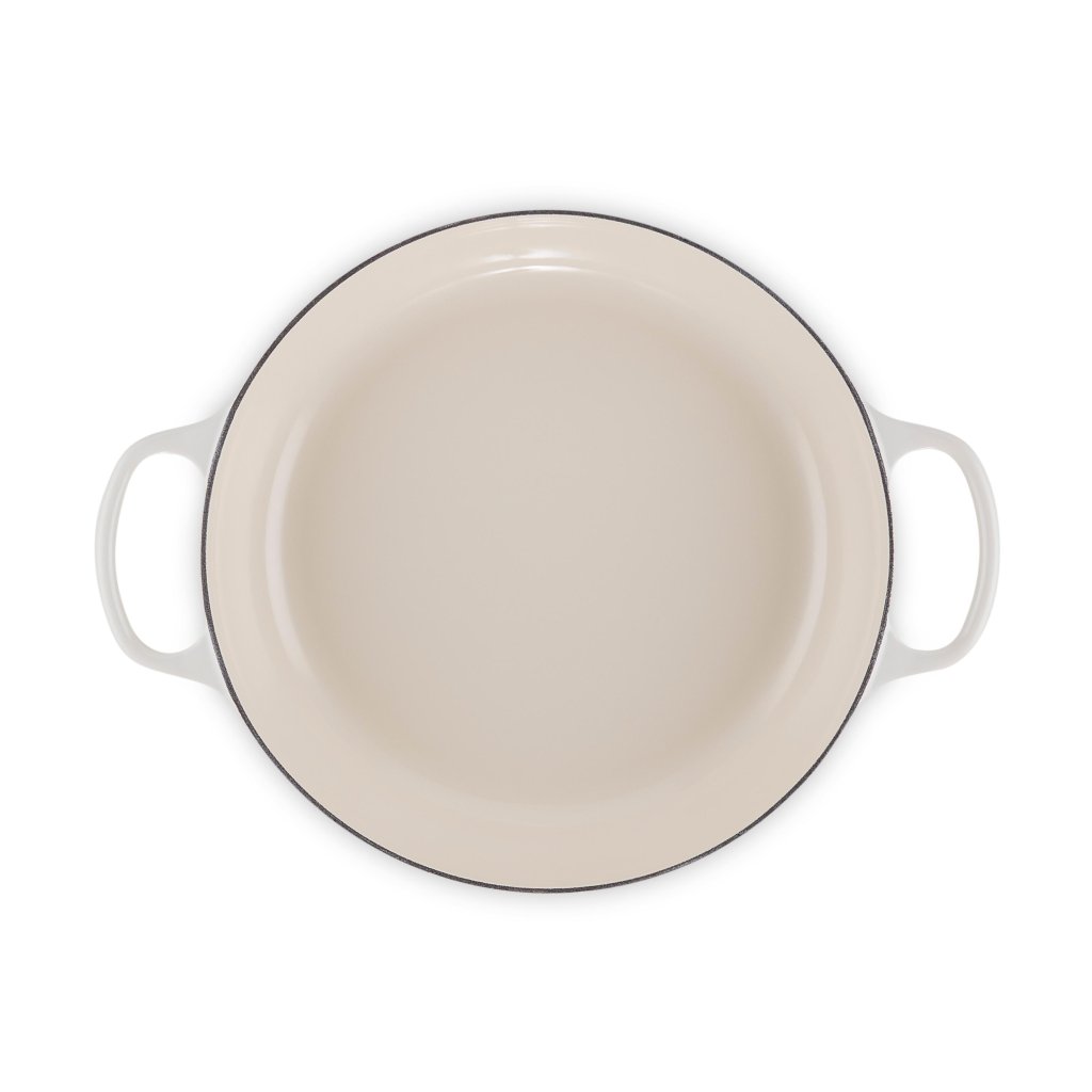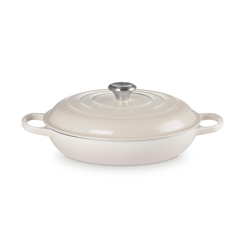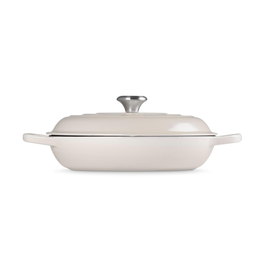 - De platte gietijzeren pan casserole pan Le Creuset in de kleur MERINGUE wordt in Frankrijk gemaakt en is een van de legendarische exemplaren van het merk, ideaal om te stoven, braden, bakken en stoven voor 4 - 6 personen.
