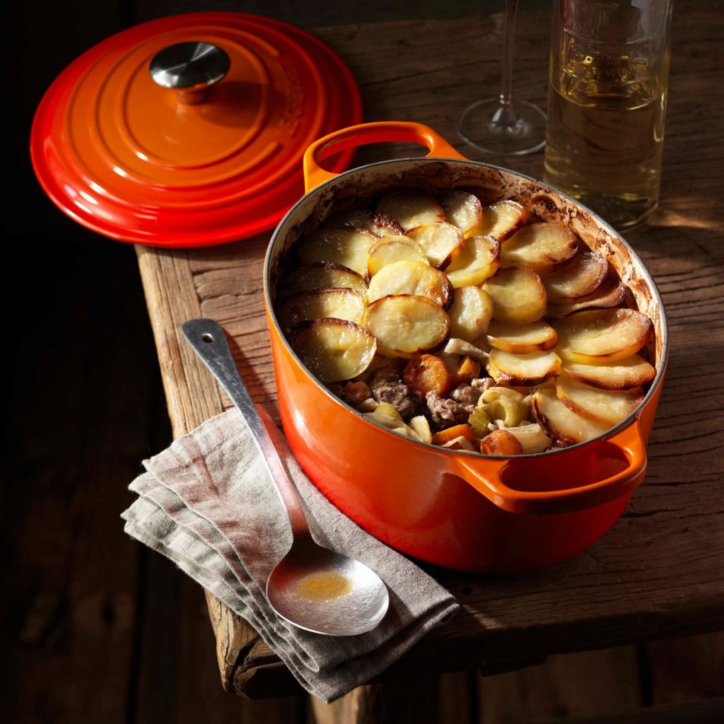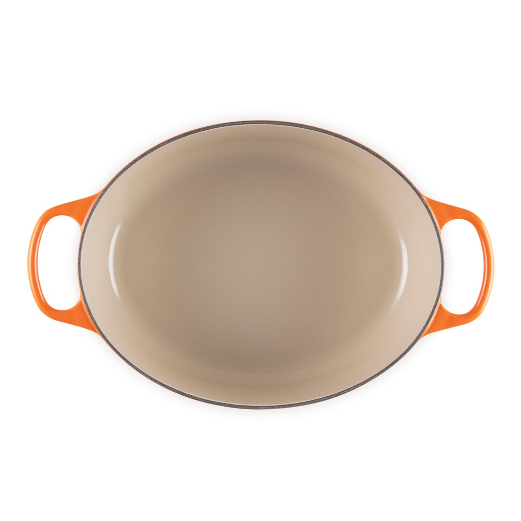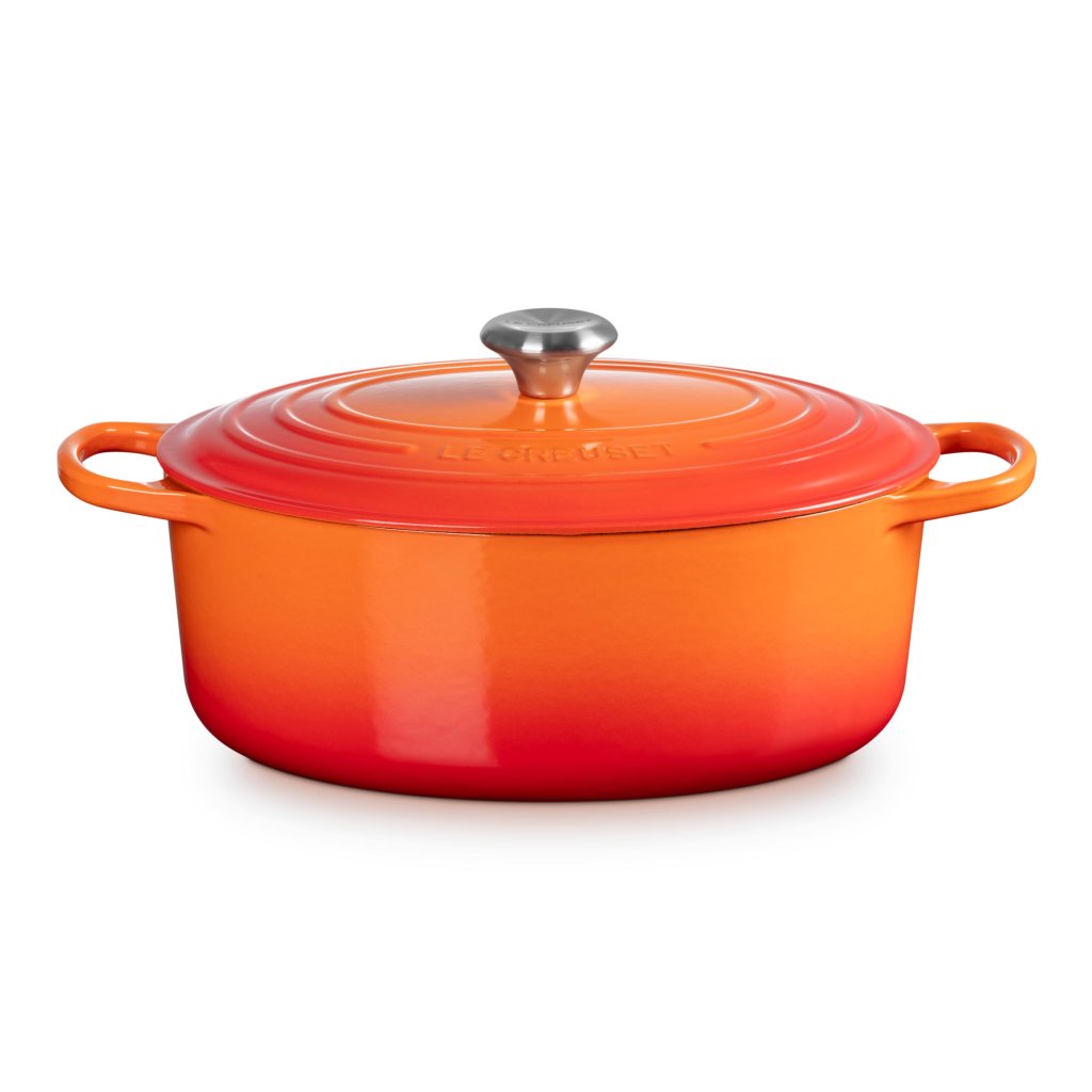 - De ovale gietijzeren pan casserole pan Le Creuset in de kleur FLAME is een universele keukenhulp die ruim genoeg is om een hele lamsbout in te bakken en tegelijkertijd smal genoeg om in de oven ruimte over te laten voor bijgerechten.