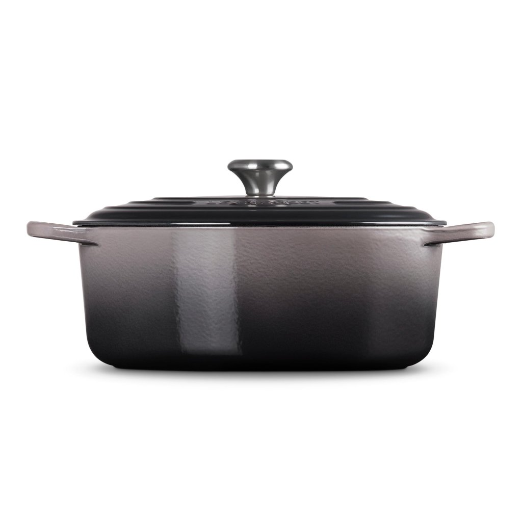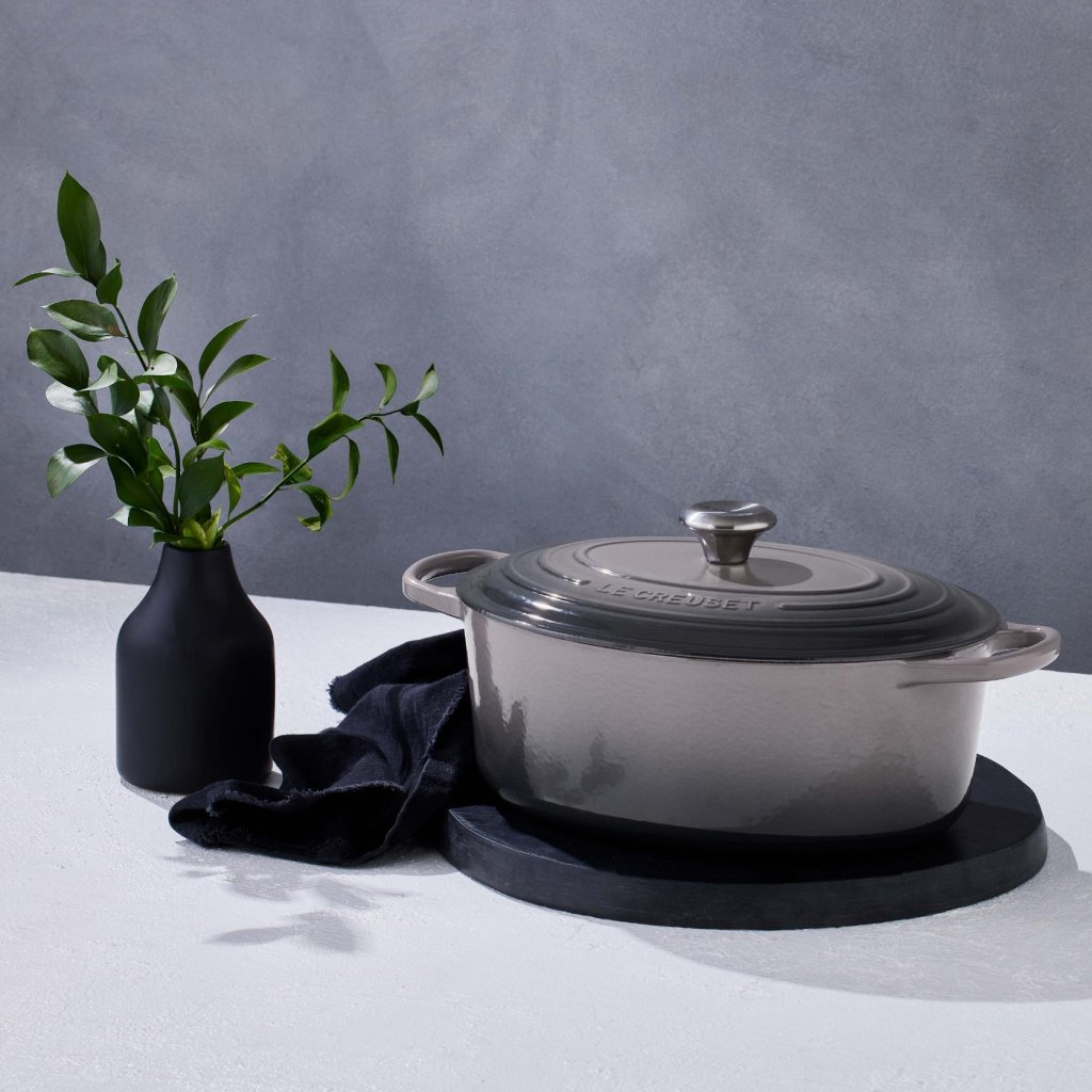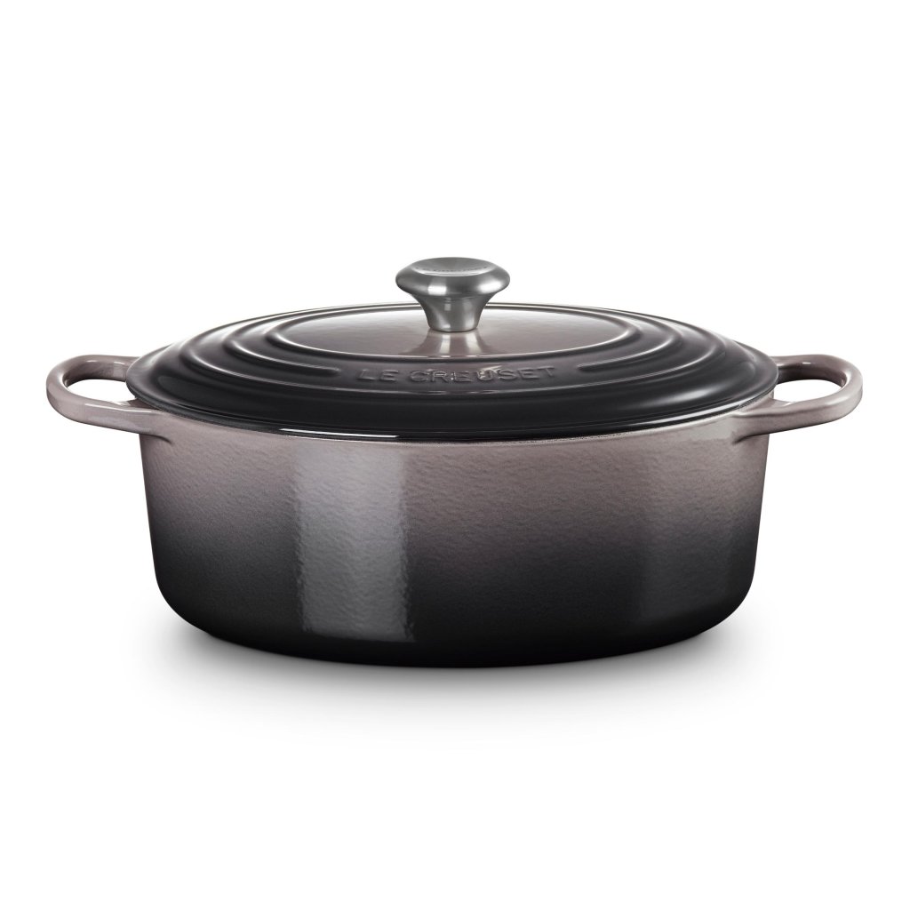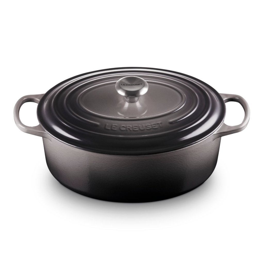 - De ovale gietijzeren pan casserole pan Le Creuset in de kleur FLINT is een universele keukenhulp die ruim genoeg is om een hele lamsbout in te bakken en tegelijkertijd smal genoeg om in de oven ruimte over te laten voor bijgerechten.