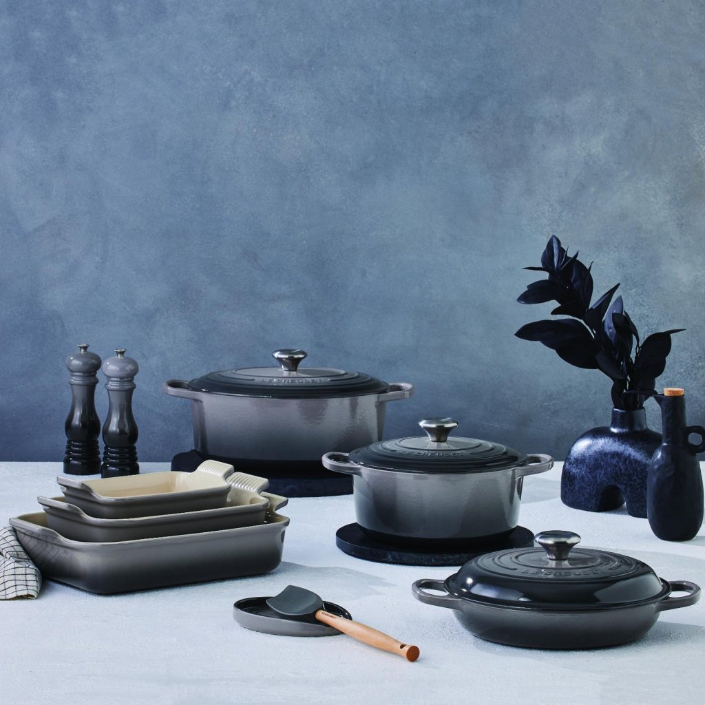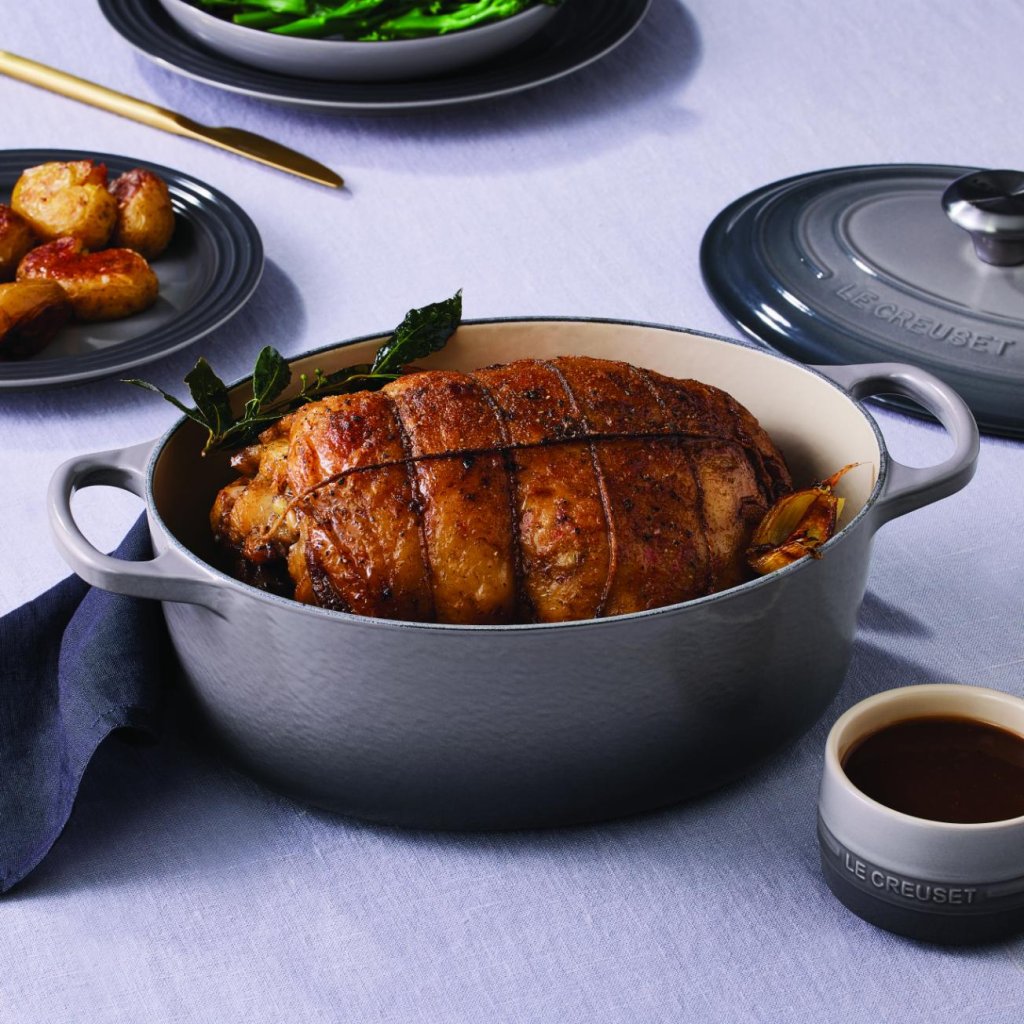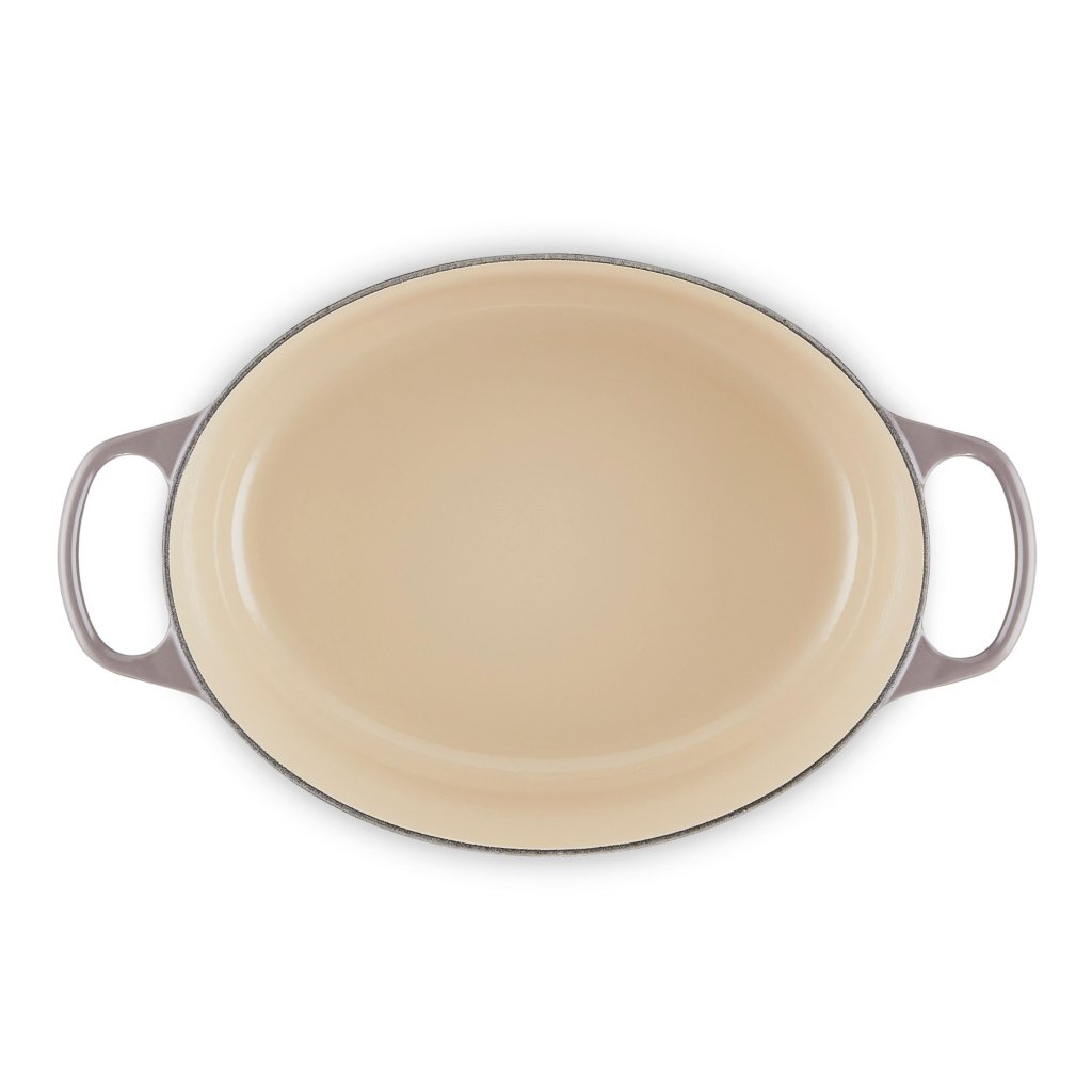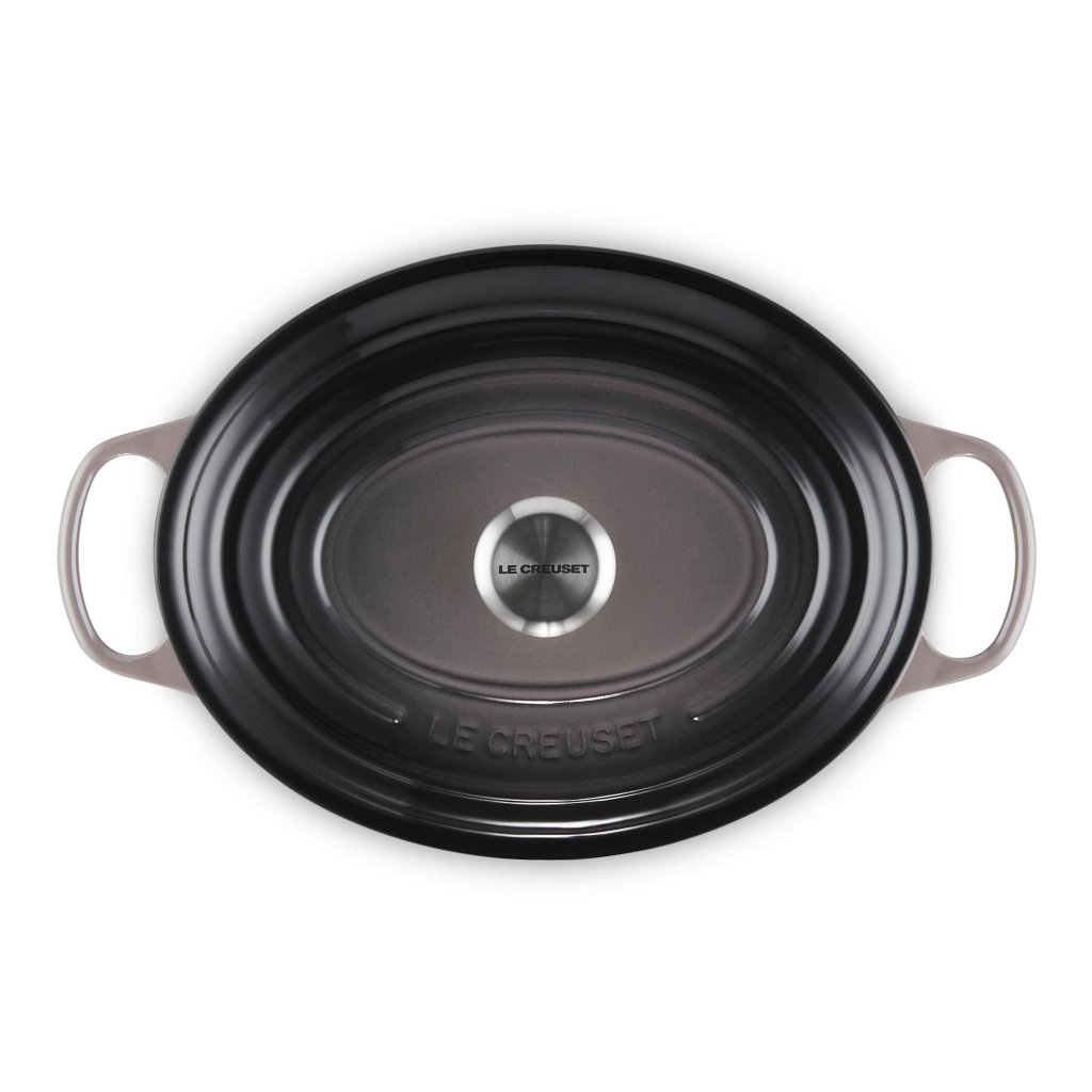 - De ovale gietijzeren pan casserole pan Le Creuset in de kleur FLINT is een universele keukenhulp die ruim genoeg is om een hele lamsbout in te bakken en tegelijkertijd smal genoeg om in de oven ruimte over te laten voor bijgerechten.