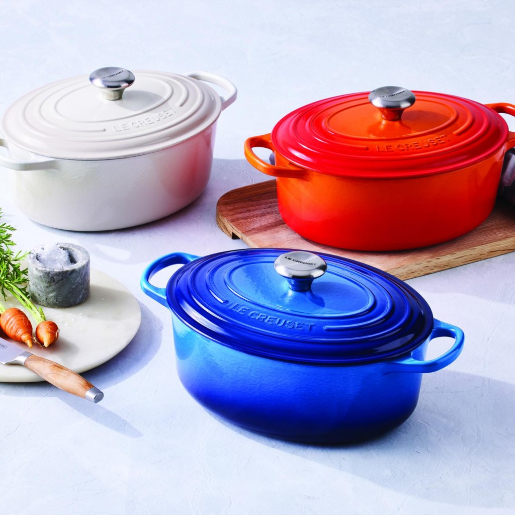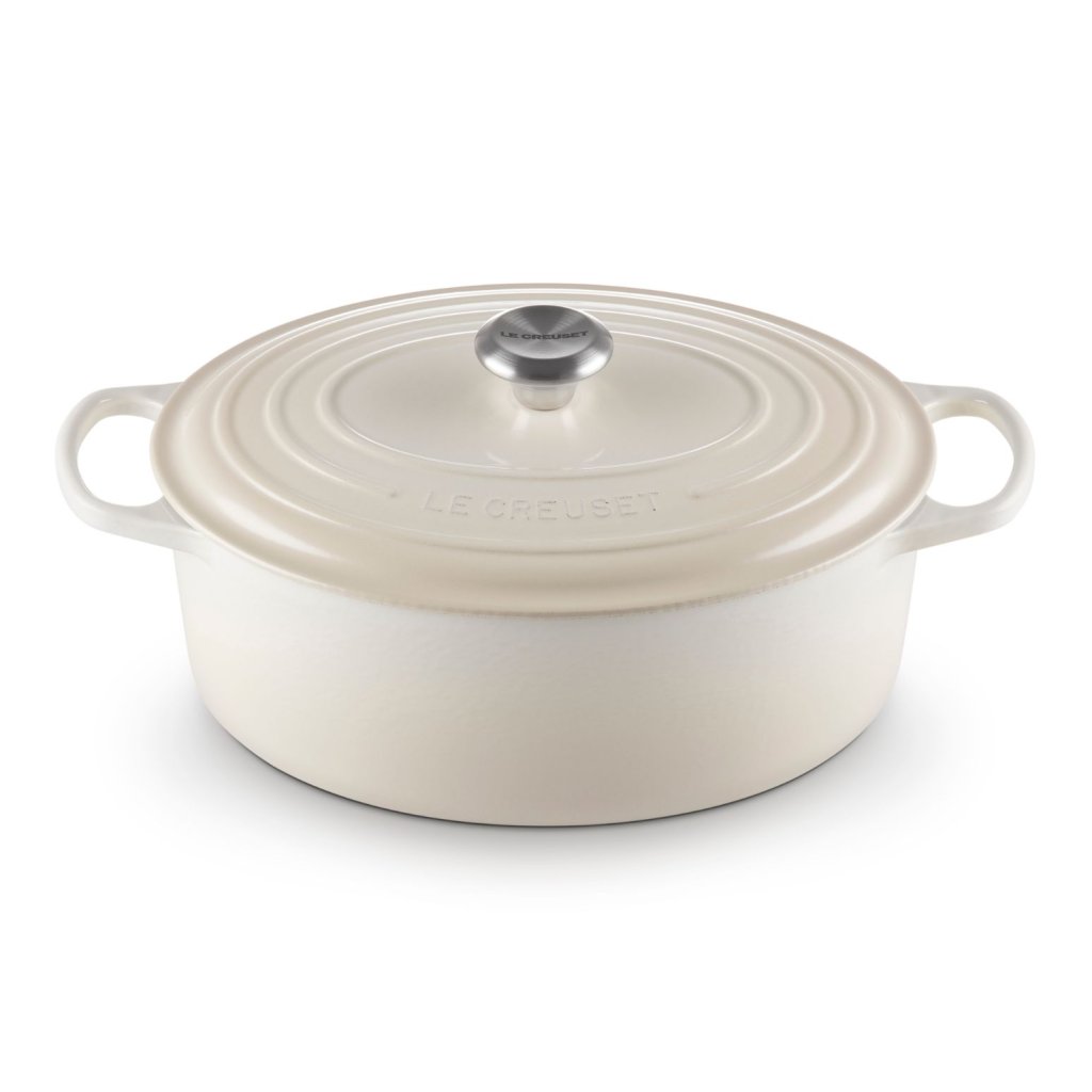- De ovale gietijzeren pan casserole pan Le Creuset in de kleur MERINGUE is een universele keukenhulp die ruim genoeg is om een hele lamsbout in te bakken en tegelijkertijd smal genoeg om in de oven ruimte over te laten voor bijgerechten.