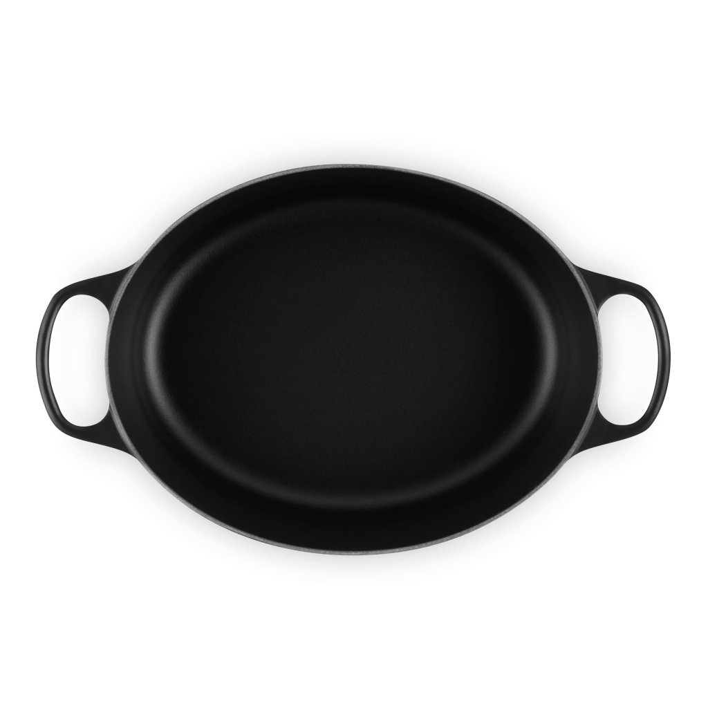 - De ovale gietijzeren pan casserole pan Le Creuset in de kleur SATIN BLACK is een universele keukenhulp die ruim genoeg is om een hele lamsbout in te bakken en tegelijkertijd smal genoeg om in de oven ruimte over te laten voor bijgerechten.
