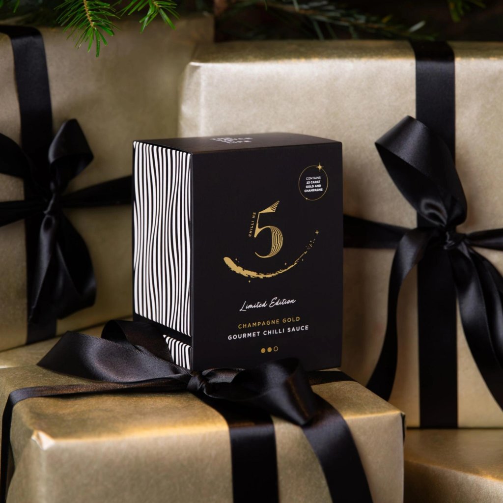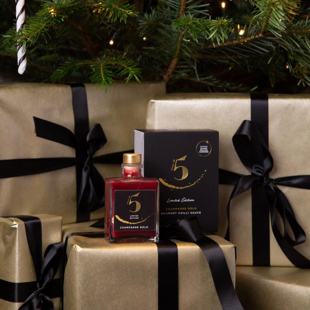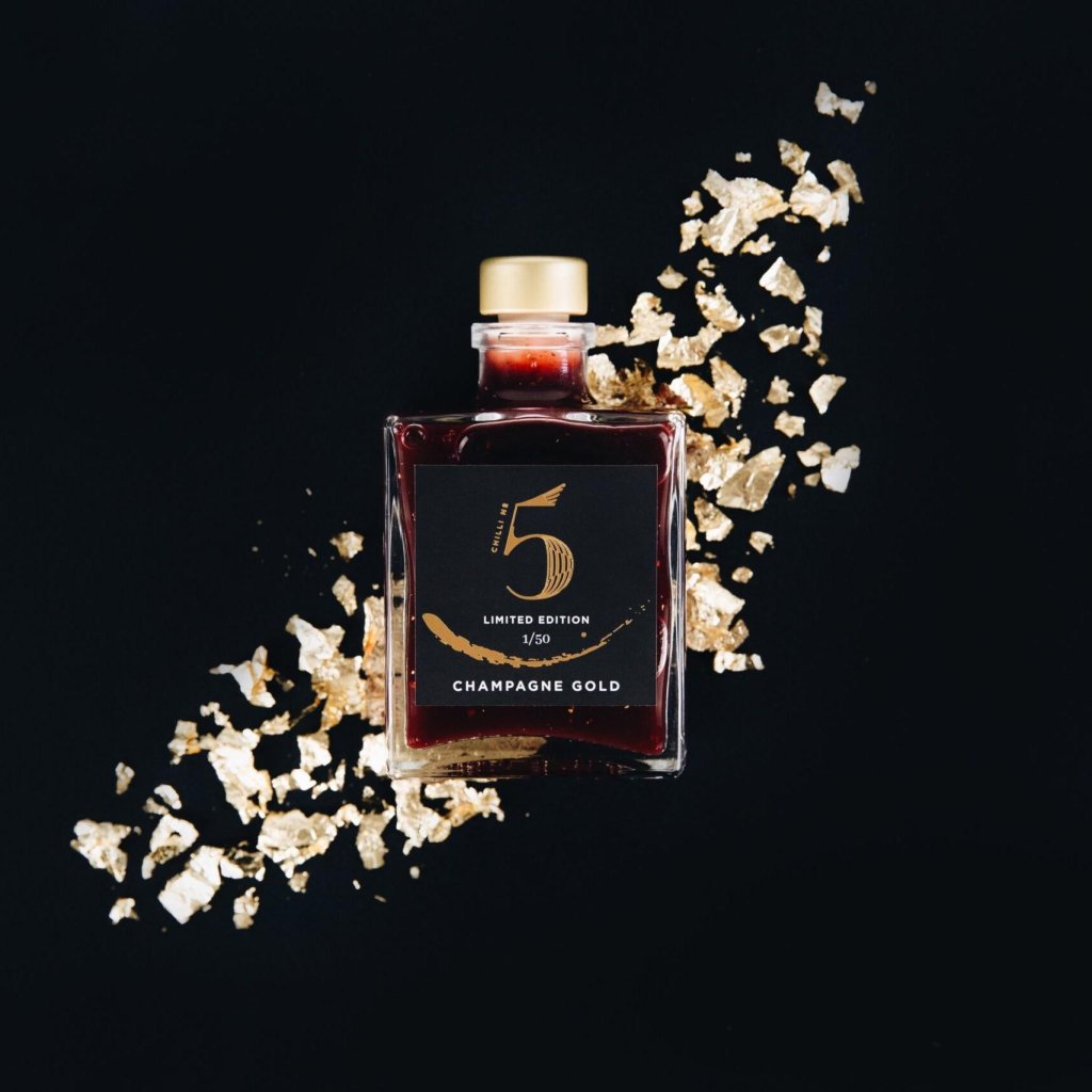 - CHAMPAGNE GOLD van Chilli No5 is een exclusieve, gelimiteerde luxe chilisaus, speciaal ontwikkeld om de jaarwisseling en onvergetelijke feestdagen te vieren.