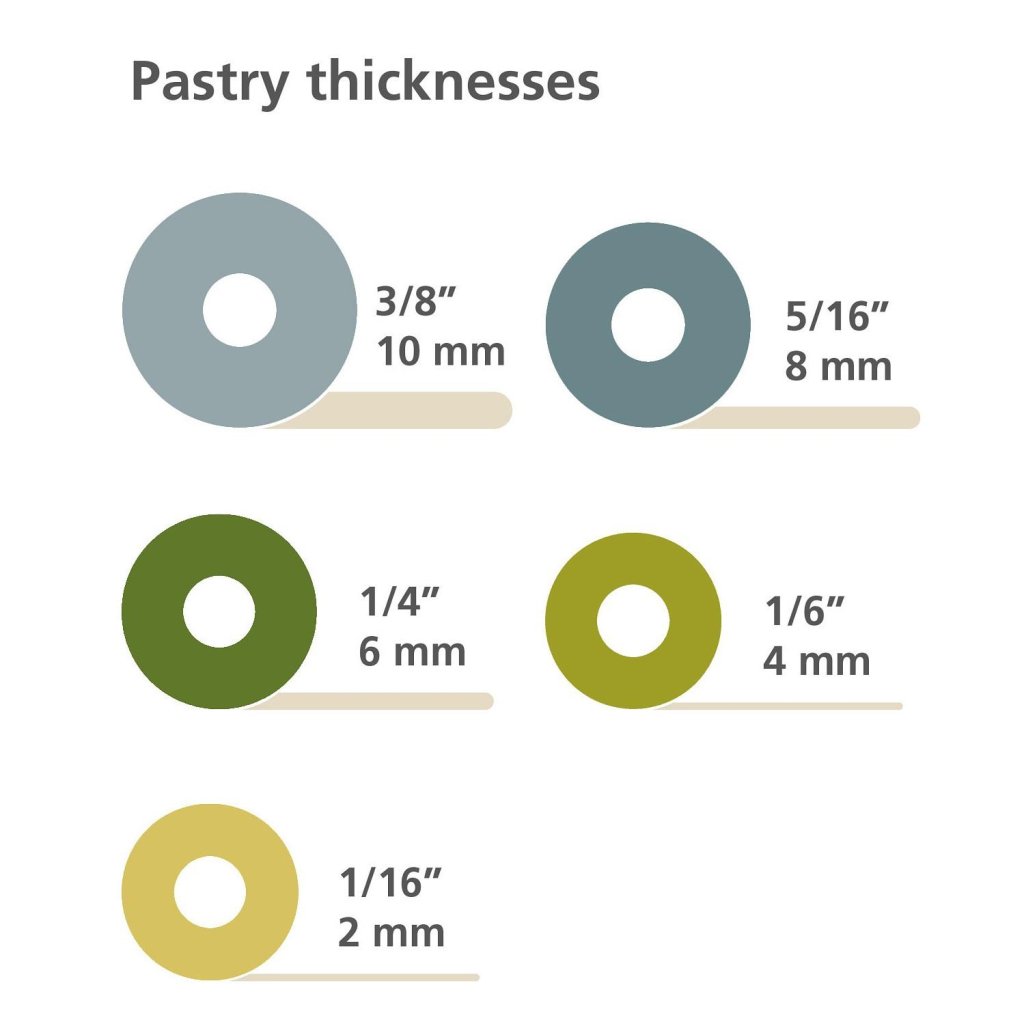 - Vijf paar afneembare gekleurde ringen stellen eenvoudig de rolhoogte in op 2, 4, 6, 8 of 10 millimeter, afhankelijk van het specifieke recept.