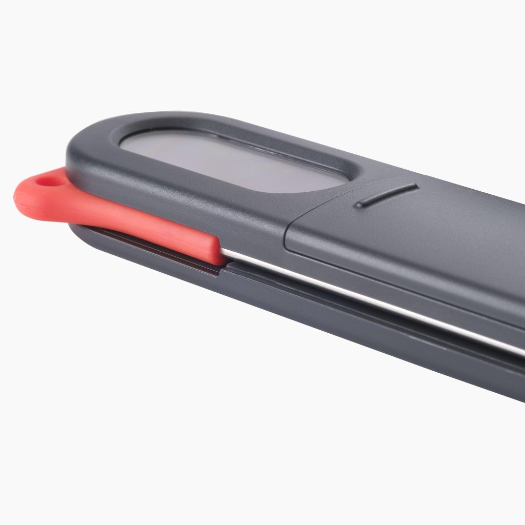 - Het compacte ontwerp met de mogelijkheid om de sonde in te klappen, beschermt de scherpe punt tijdens opslag en bespaart tegelijkertijd ruimte in de keukenkast.