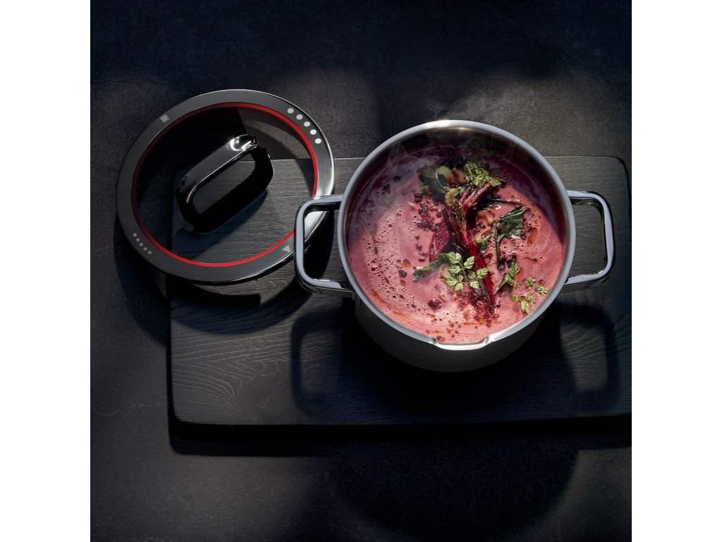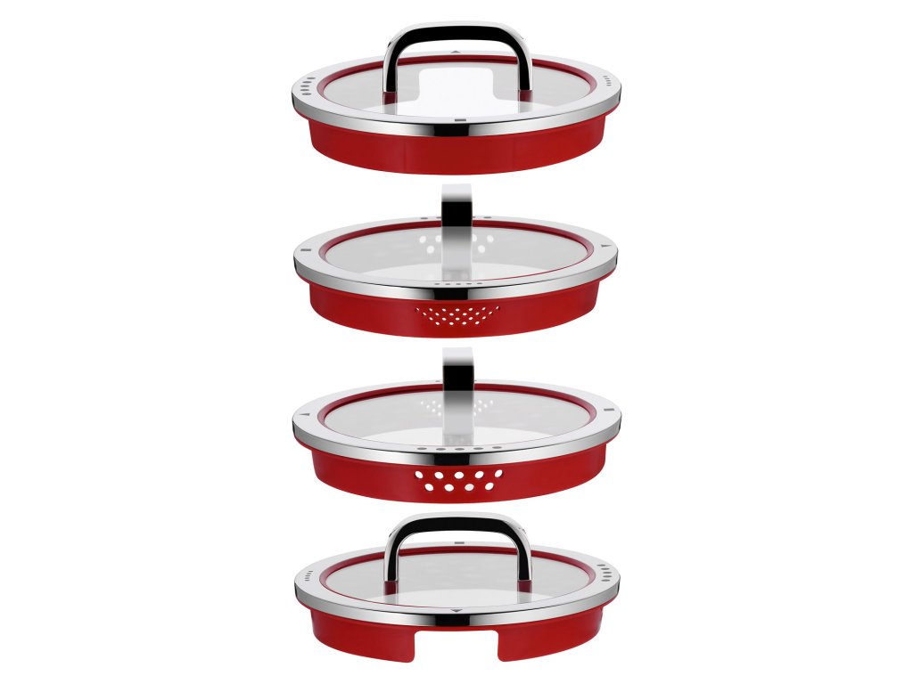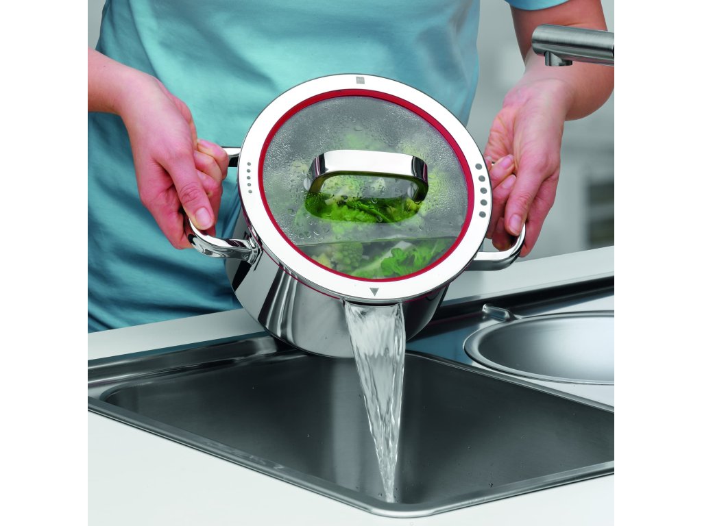 De ontwerpers van NOA Design hebben de Function potten voorzien van 4 unieke deksels. Deze stevige glazen deksels met roestvrijstalen handvatten hebben een voldoende groot kijkvenster om de inhoud van de potten gemakkelijk te kunnen inspecteren - plus een siliconen ring voor schokabsorptie. Ze hebben de toegevoegde waarde van een gecontroleerde schenkfunctie zonder het gebruik van een vergiet, wat zowel tijd als afwas bespaart. De symbolen op de bovenkant van het deksel geven aan hoe het deksel moet worden geplaatst voor het koken met kleine hoeveelheden water, voor het afgieten van aardappelen, pasta, rijst of voor het snel afgieten van de inhoud.