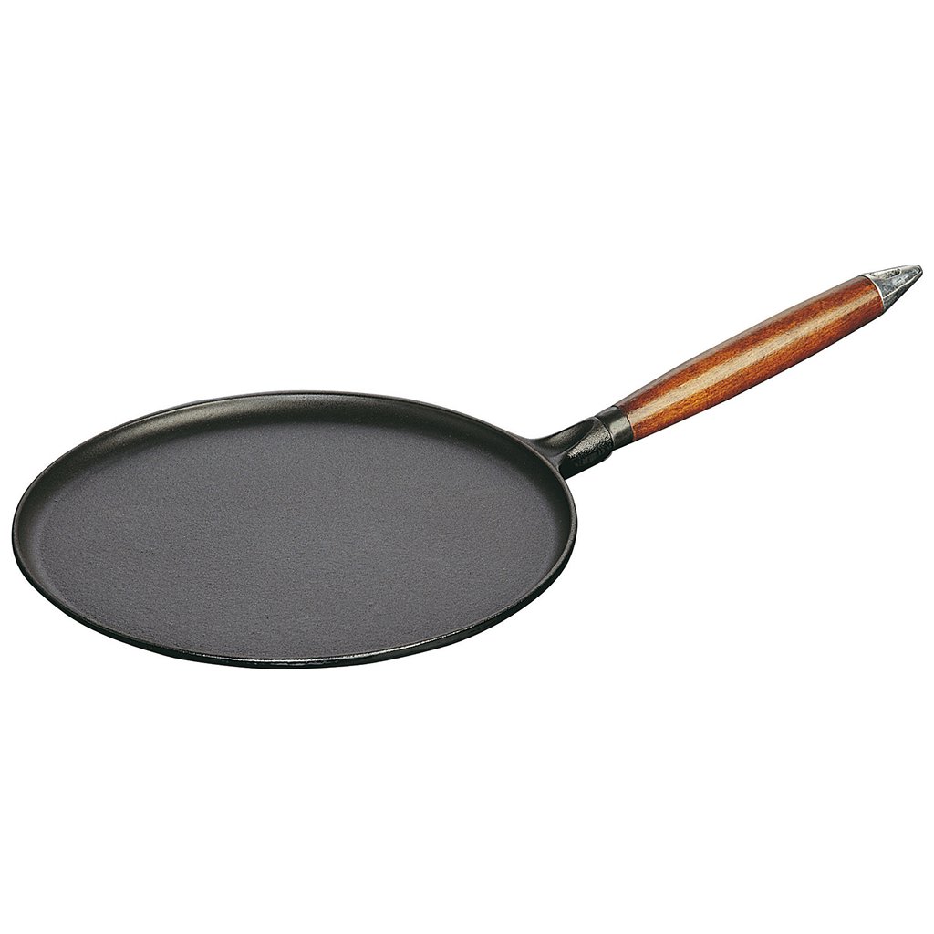 Pannenkoekenplaat ⌀ 28 cm Staub in traditioneel design is precies goed voor het maken van dunne en luchtige pannenkoeken die niet plakken. Pan met gladde geëmailleerde bodem is geschikt voor alle soorten kookplaten, inclusief inductie. Het houten handvat wordt niet warm tijdens het gebruik. De vorm is ideaal om het beslag te verdelen en de pannenkoeken gemakkelijk om te draaien.