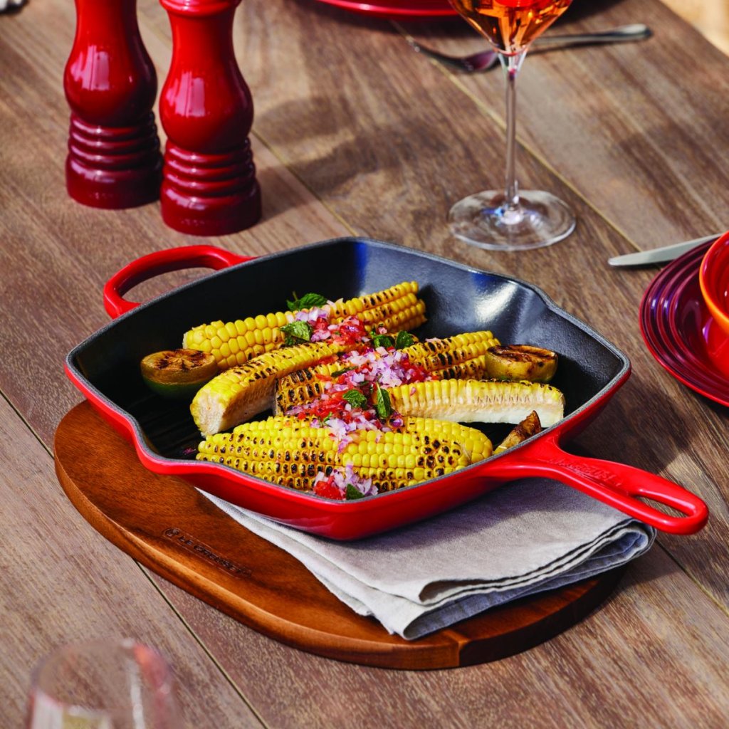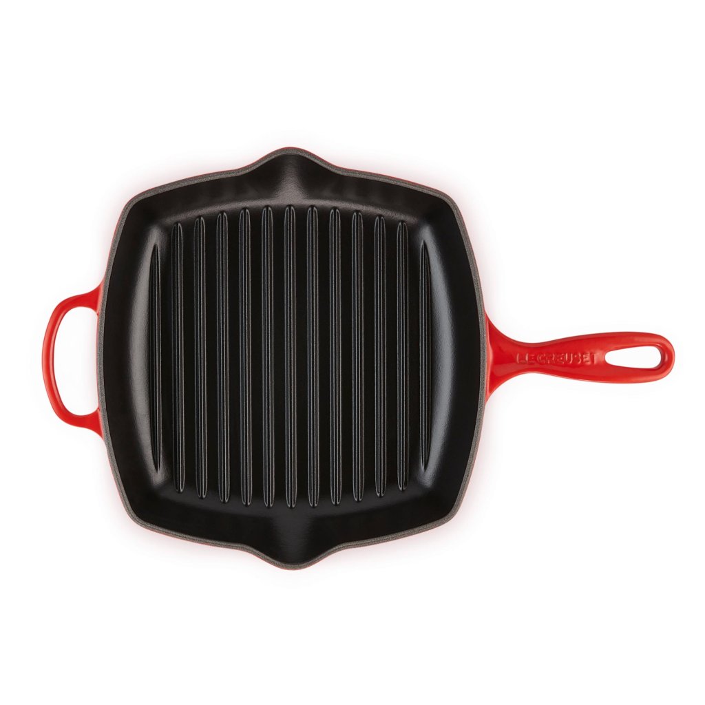 - De vierkante gietijzeren grilpan Le Creuset in de kleur CERISE is ideaal voor het snel stoven van vlees, vis en groenten, waarbij de smaak en sappigheid behouden blijven.