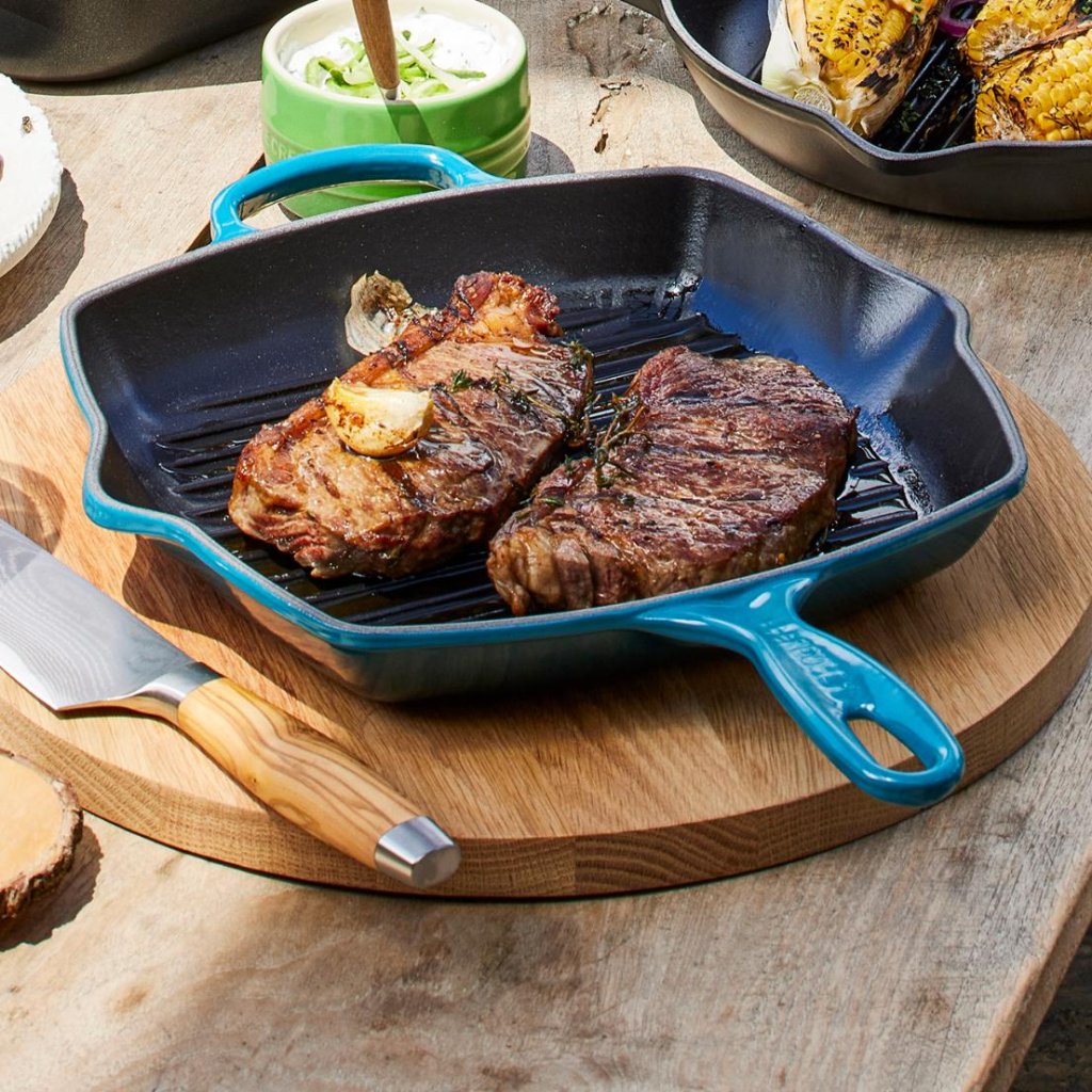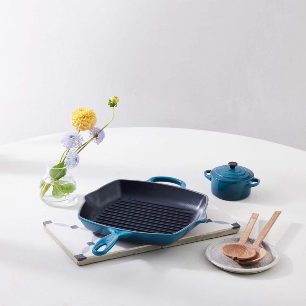 - De vierkante gietijzeren grilpan Le Creuset in de kleur DEEP TEAL is ideaal voor het snel stoven van vlees, vis en groenten, waarbij de smaak en sappigheid behouden blijven.
