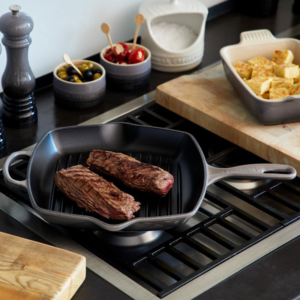 - De vierkante gietijzeren grilpan Le Creuset in de kleur FLINT is ideaal voor het snel stoven van vlees, vis en groenten, waarbij de smaak en sappigheid behouden blijven.