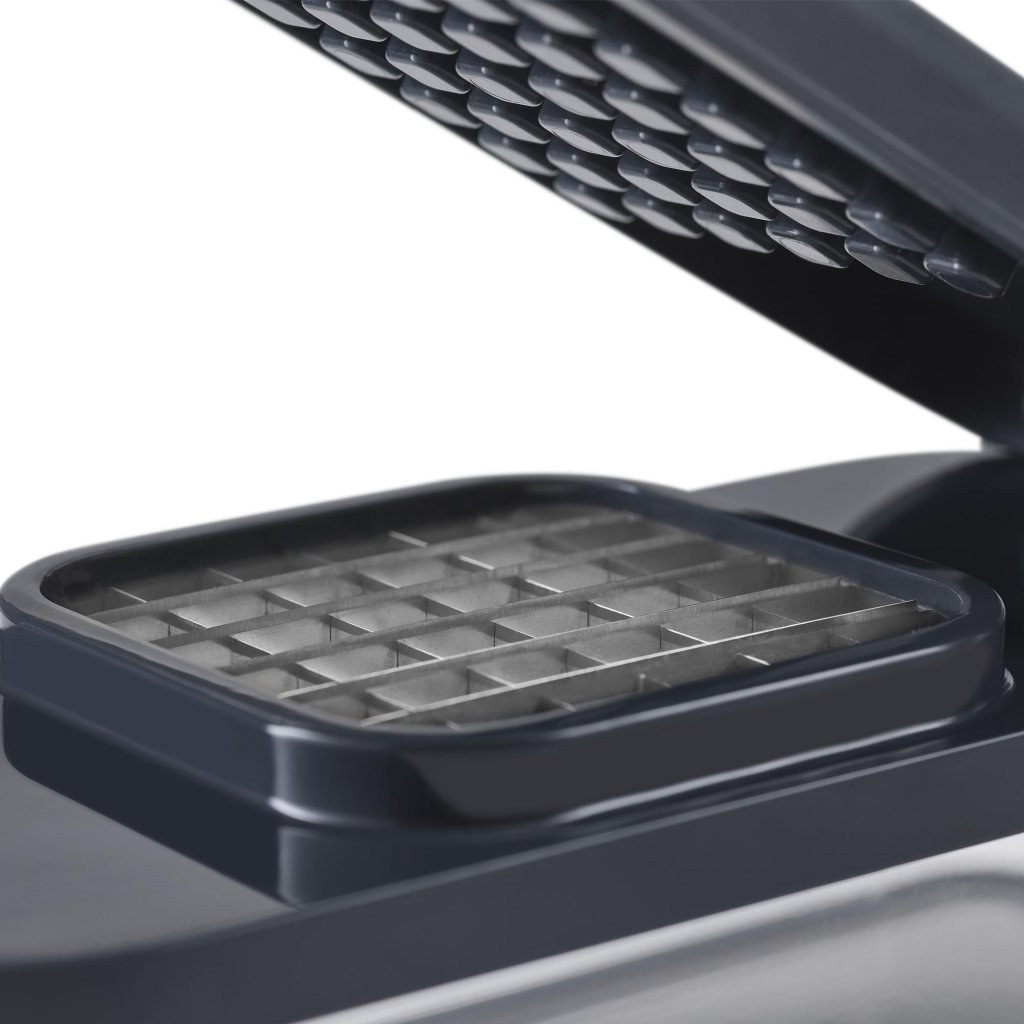 - Met het hakaccessoire met roestvrijstalen rooster kunt u groenten of andere ingrediënten snel in gelijkmatige, kleine blokjes snijden.