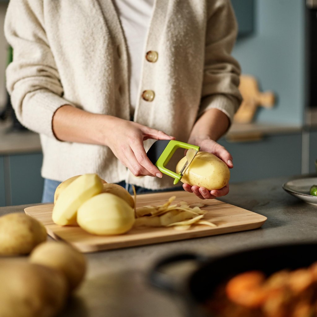 Aardappelschillen is precies de activiteit die niemand viert, maar iedereen moet doorstaan. Deze rechte dunschiller ziet het als een snelle warming-up. Een paar snelle bewegingen en de wortel of aardappel is klaar, zonder dat je het gevoel hebt dat je net een krachttraining voor je polsen hebt gedaan.