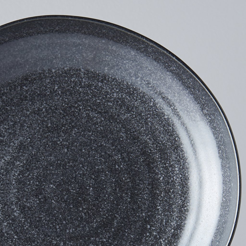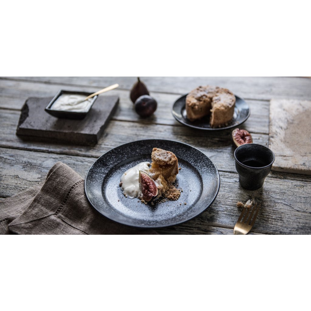 Het servies uit de Matt collectie is uitgevoerd in een matte afwerking en in zwart en grijs. De randen zijn afgewerkt met een glanzend glazuur dat mooi contrasteert met het matte centrum. Een deel van het kookgerei uit de Matt-collectie heeft een halfglanzende afwerking en waar de matte afwerking de glanzende afwerking ontmoet, ontstaat een interessant effect dat lijkt op vrij vloeiende verf.