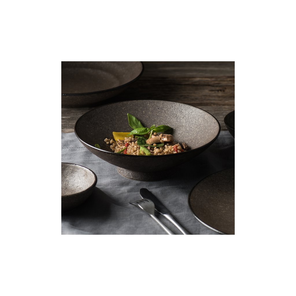 De collectie Earth Black wordt gekenmerkt door aardse kleuren, een korrelig oppervlak en een rand met een donker glanzend glazuur. Het servies uit deze collectie ziet eruit alsof het van steen is en voegt een portie eeuwenoude luxe toe aan uw eetervaring.