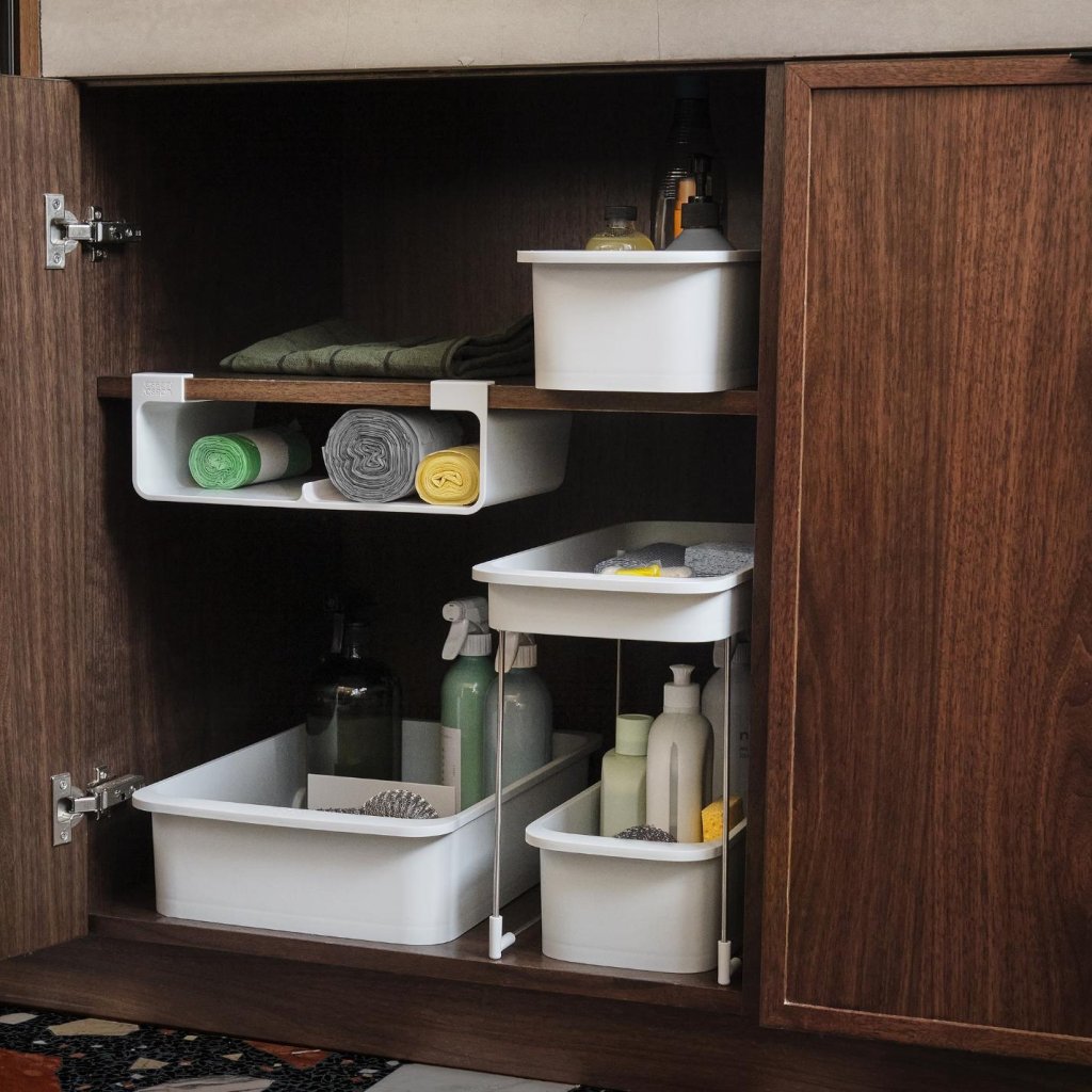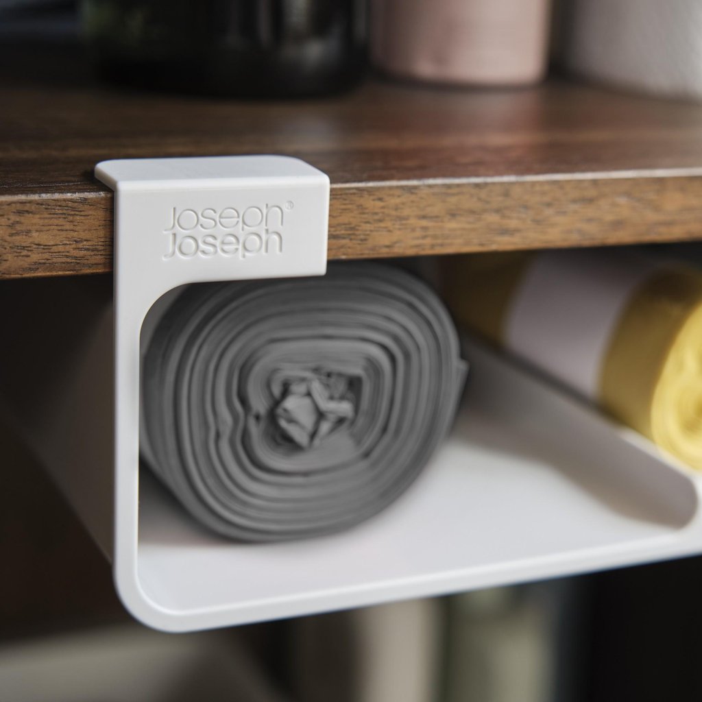- De Joseph Joseph CUPBOARDSTORE organizer helpt de vrije ruimte onder de plank van een keukenkast te benutten en creëert een praktische opbergplek voor keukenfolie, aluminiumfolie of zakjes.