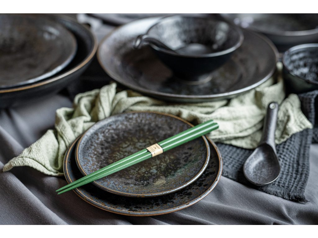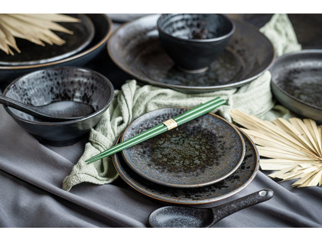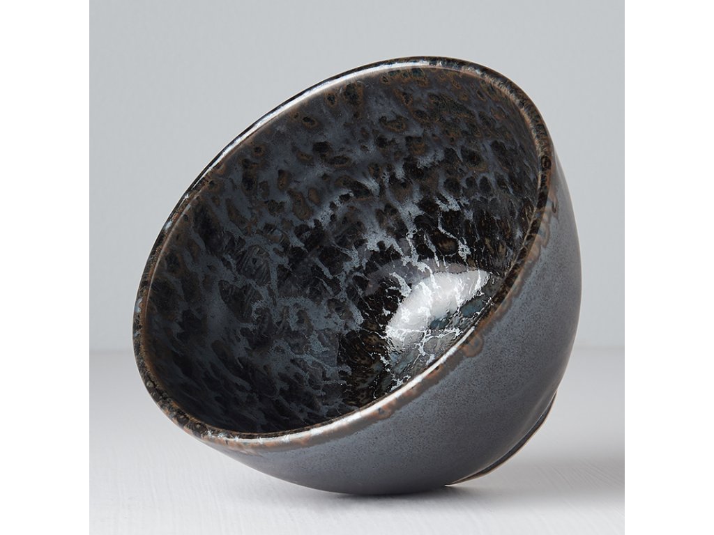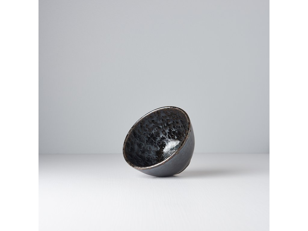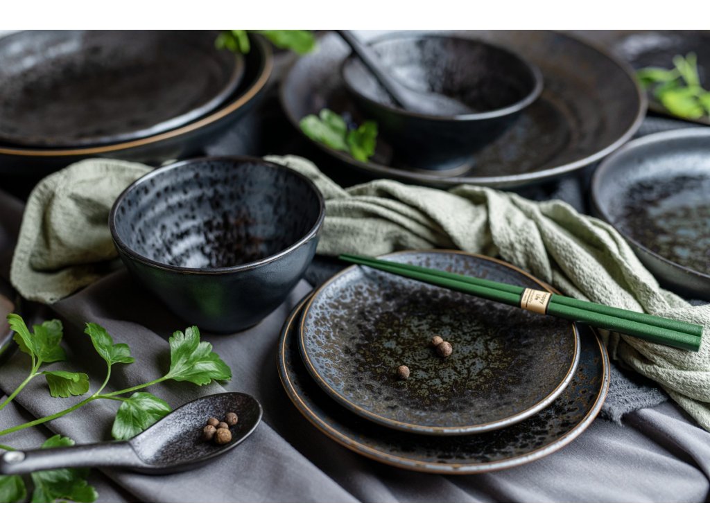 De schalen uit de Black Pearl collectie zijn zeer interessant met hun spetterend effect op een zwarte basis, die op metaal lijkt. Het is omrand met een dunne bronzen lijn, die de grijs-zwarte kleur van het vaatwerk perfect aanvult. Op het eerste gezicht heeft het een korrelig oppervlak, maar in werkelijkheid zijn de schalen glad en glanzend.