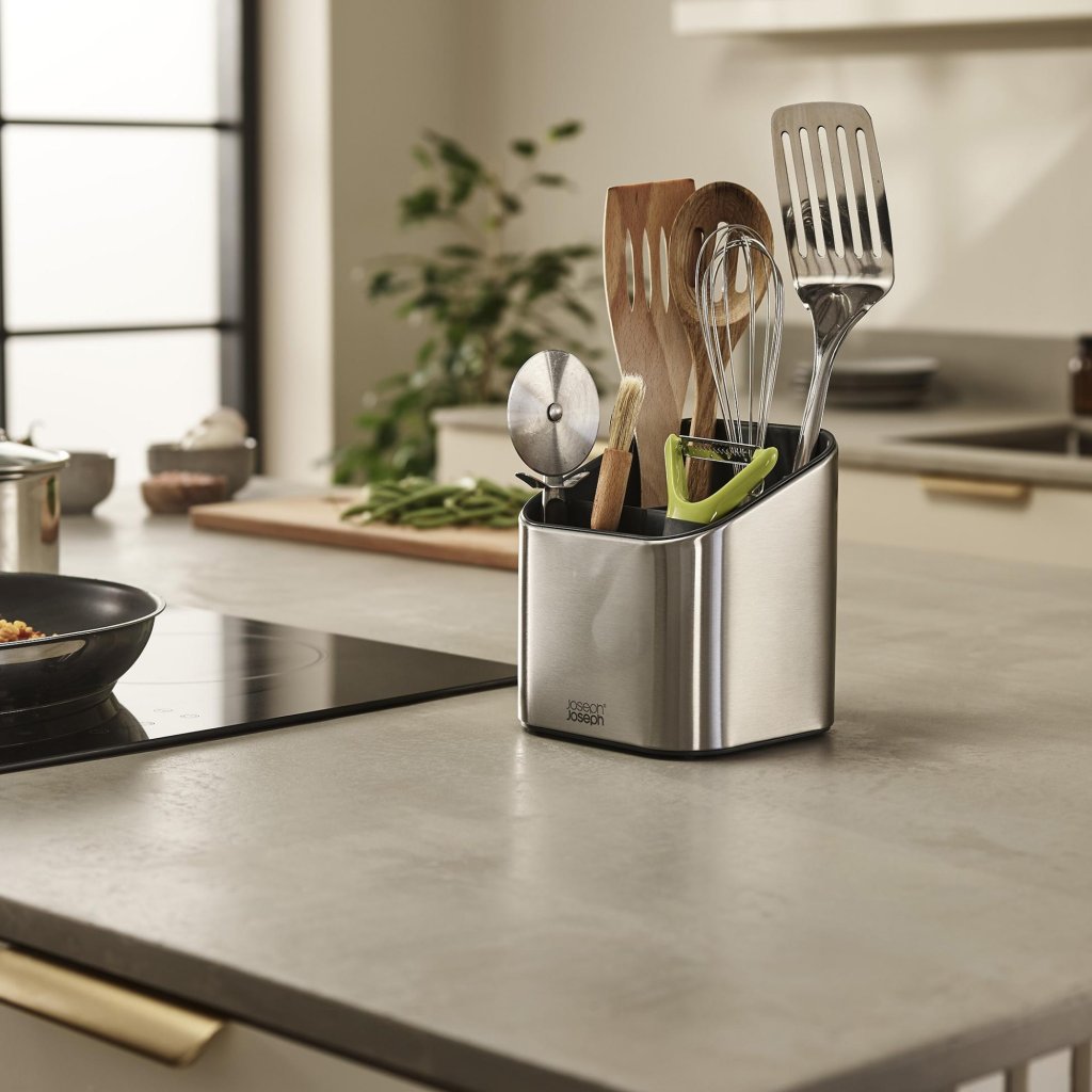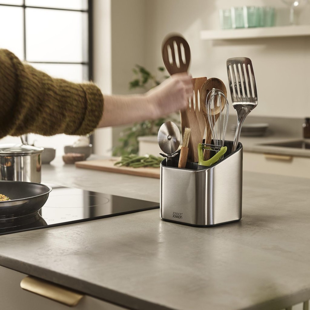 - De Joseph Joseph SURFACE keukengerei houder helpt bij het netjes organiseren van spatels, soeplepels en ander keukengerei, zodat ze altijd gemakkelijk toegankelijk zijn op het aanrecht.