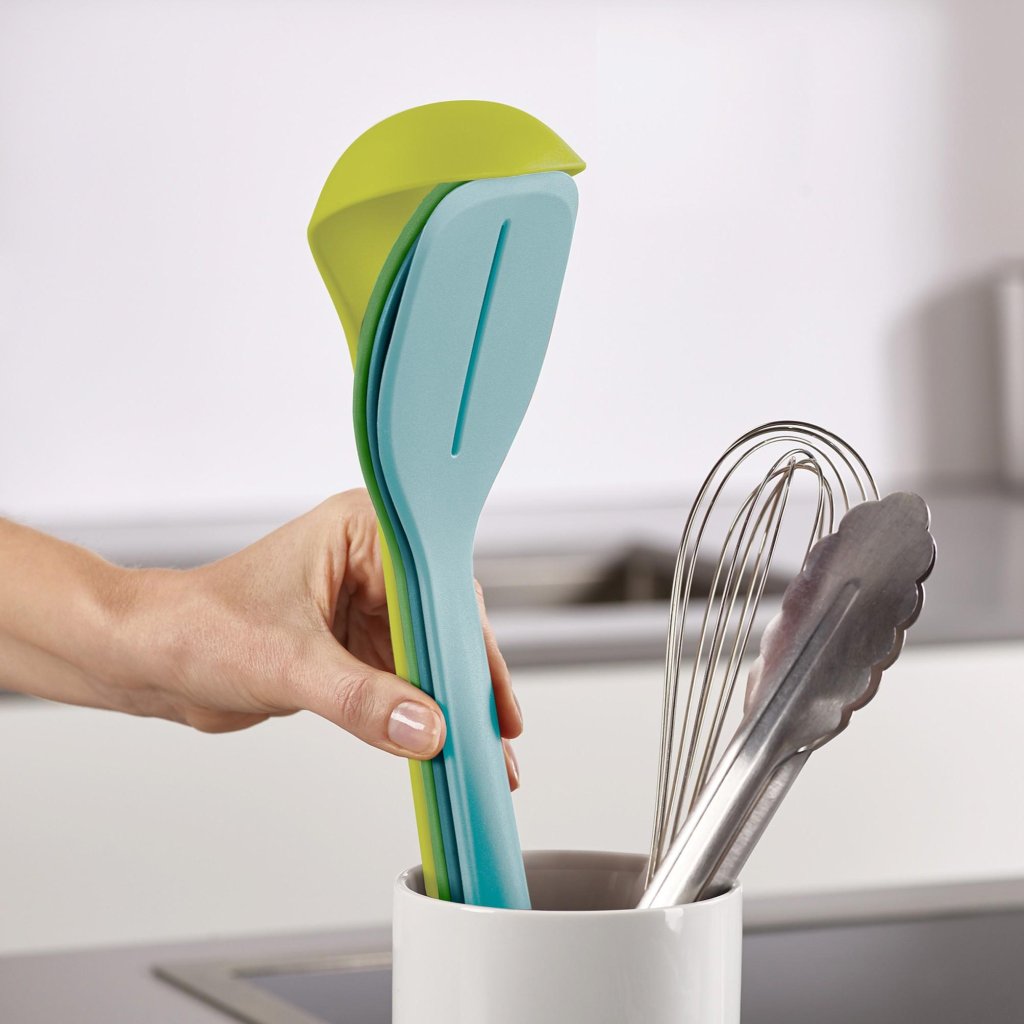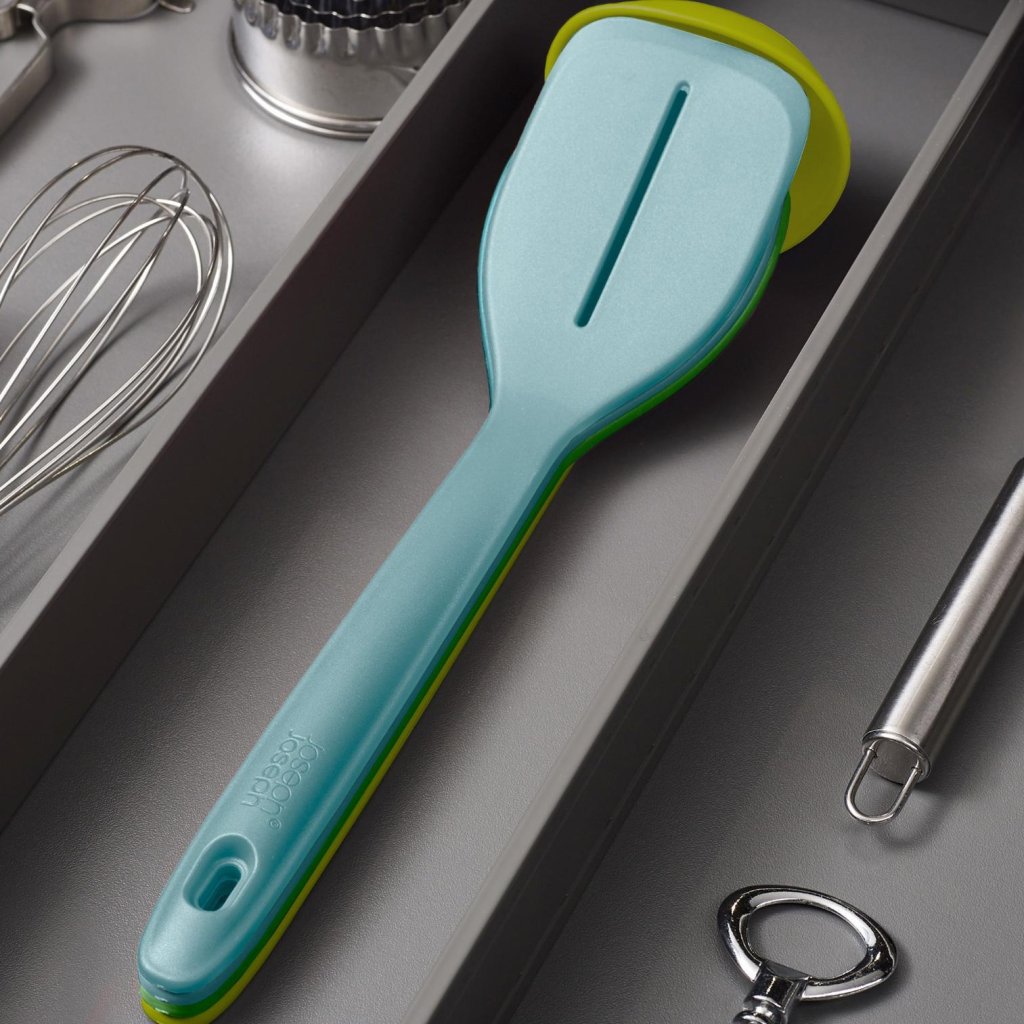 Wanneer de gereedschappen in elkaar kunnen worden geschoven, ontstaat er een klein keukenwonder. Geen kruisende handvatten, geen vastzittende spatels. Alles past met verrassende vanzelfsprekendheid in elkaar. Minimalisme dat je vooral waardeert op momenten dat je minder lades hebt dan je zou willen.