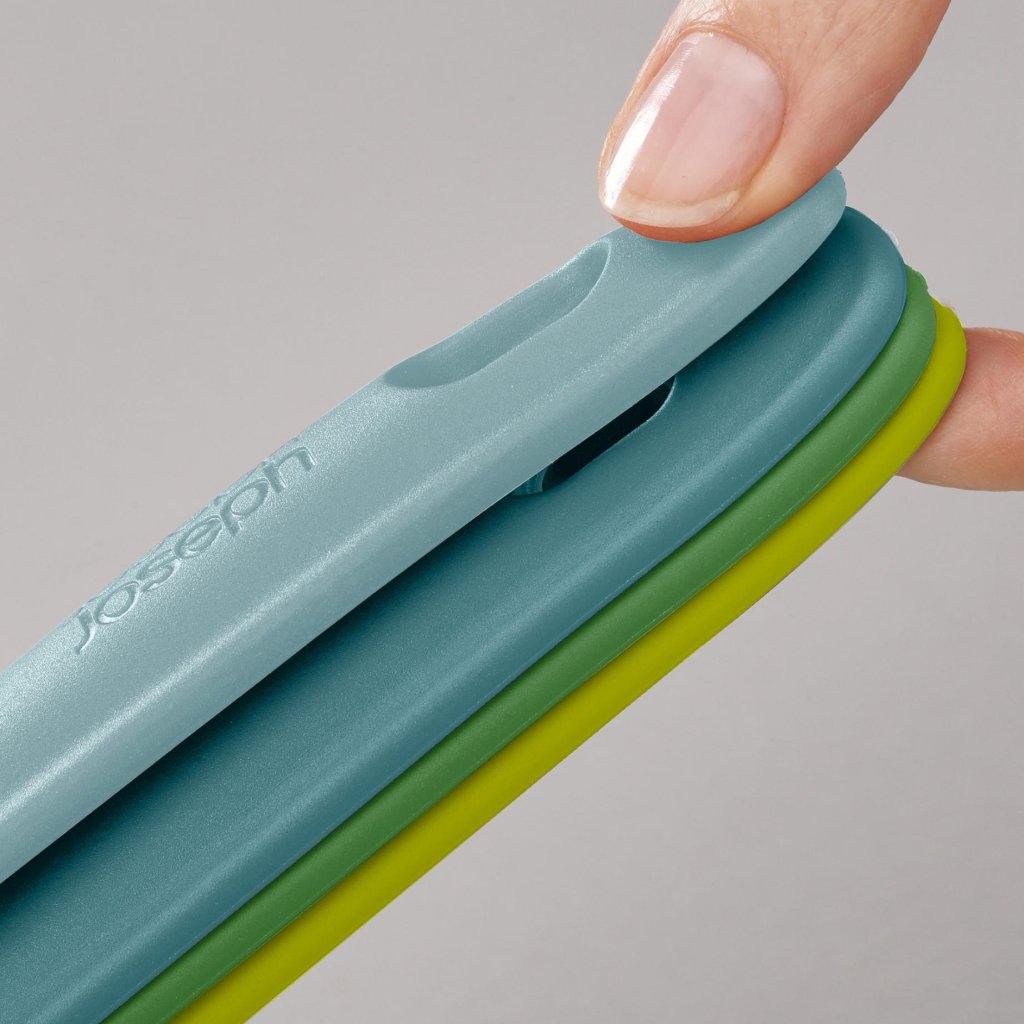 - Compact design bespaart ruimte, niet alleen in de lade, maar ook op het aanrecht bij het neerleggen tijdens het koken.
