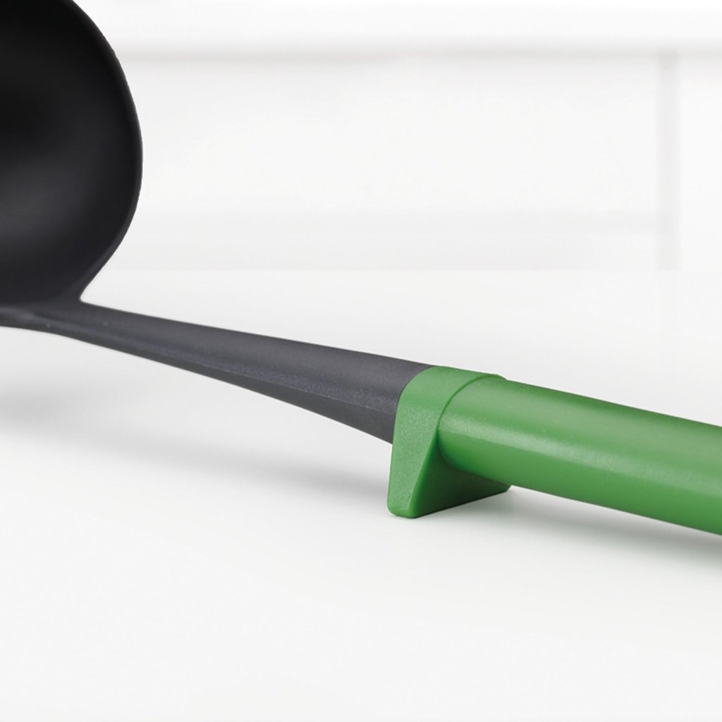 - Elk keukengereedschap is voorzien van een geïntegreerde steun die het werkgedeelte van het werkoppervlak tilt en zo helpt om de vervuiling van het aanrecht tijdens het koken te beperken.