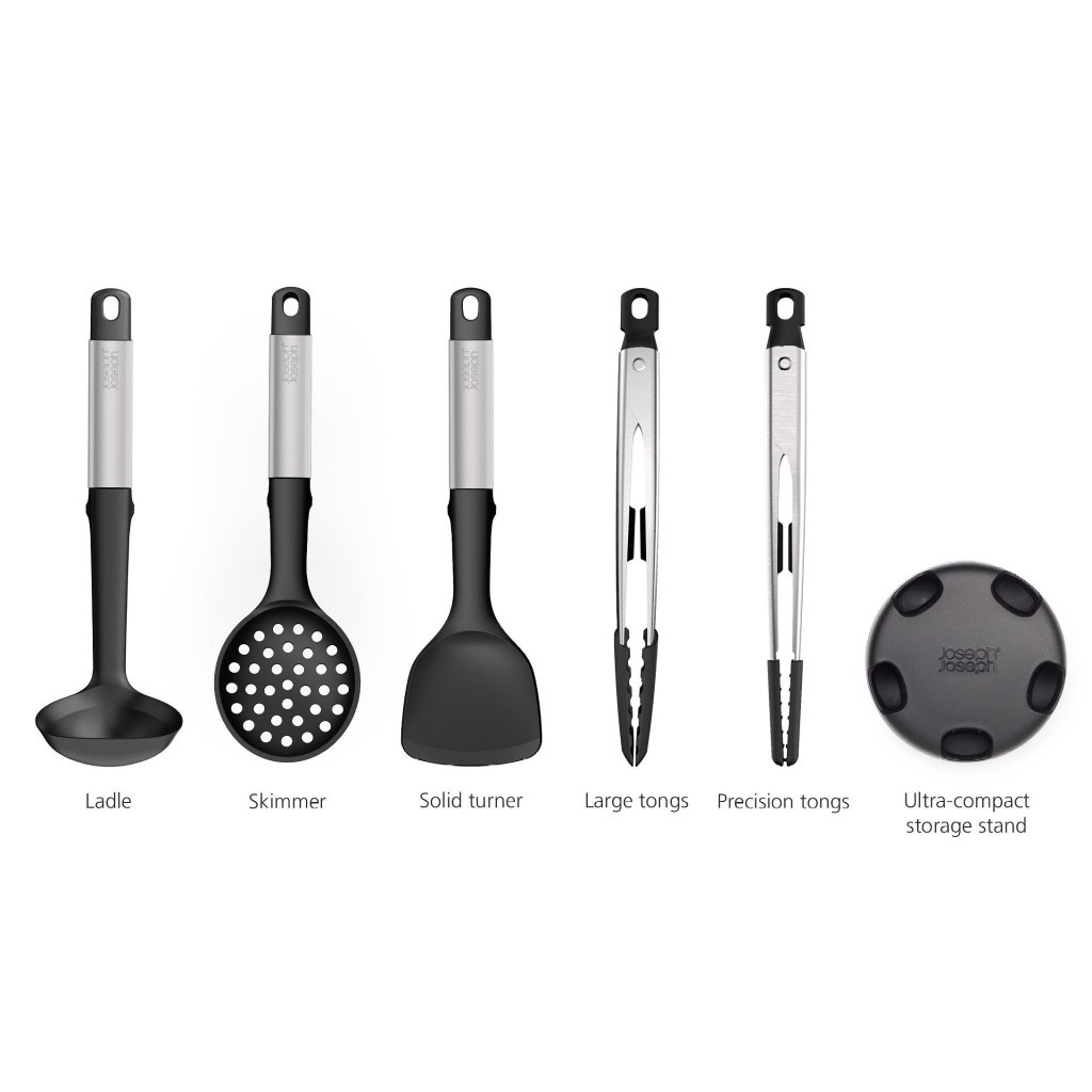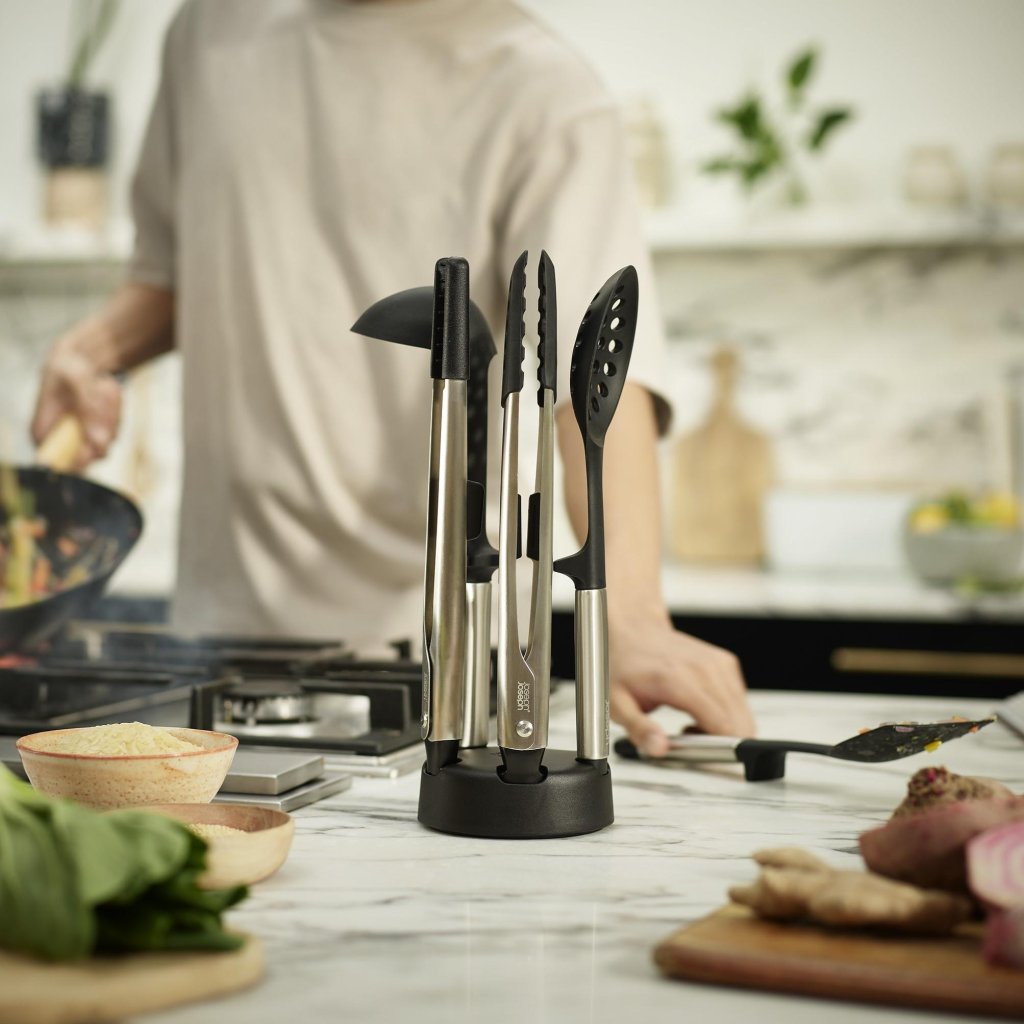 - Het biedt 5 essentiële keukengereedschappen voor dagelijks gebruik, opgeborgen in een compacte standaard voor een overzichtelijke en gemakkelijk toegankelijke opstelling op het aanrecht.
