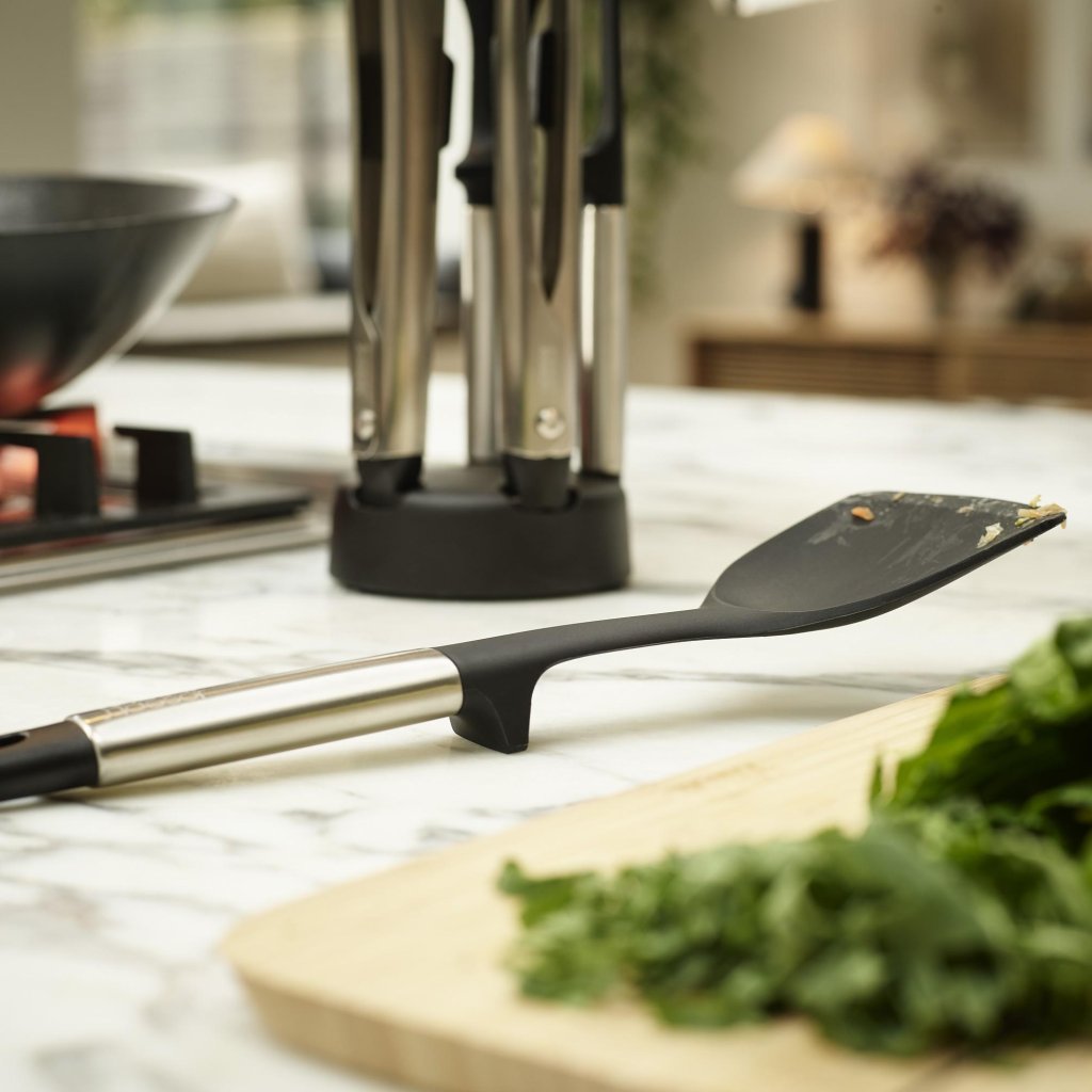 - Het compacte ontwerp van de standaard helpt ruimte te besparen op het werkblad en houdt het keukengerei overzichtelijk georganiseerd.