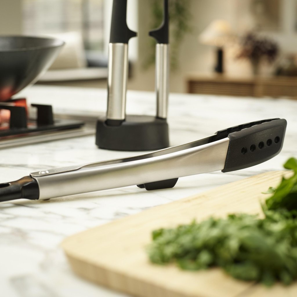 - Geïntegreerde steunen en uitgebalanceerde handgrepen voorkomen dat de werkdelen van het keukengerei het werkoppervlak raken wanneer ze worden neergelegd.