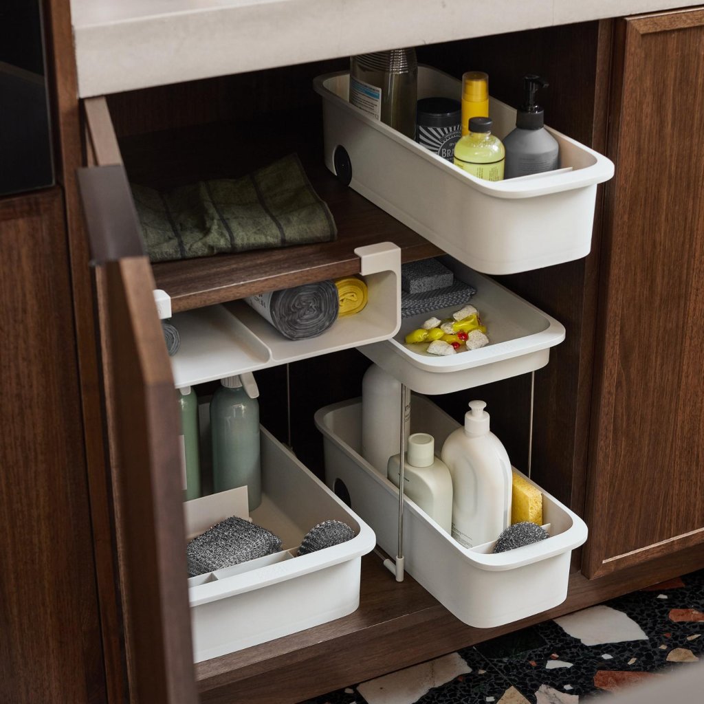 Flessen met schoonmaakmiddelen kantelen, de spons is ergens achterin verdwenen en de doek besluit zijn eigen leven te leiden? Juist op zulke momenten waardeert men een eenvoudige organizer die al deze kleine spullen een plek geeft en de chaos onder de gootsteen verandert in een verrassend overzichtelijk systeem.