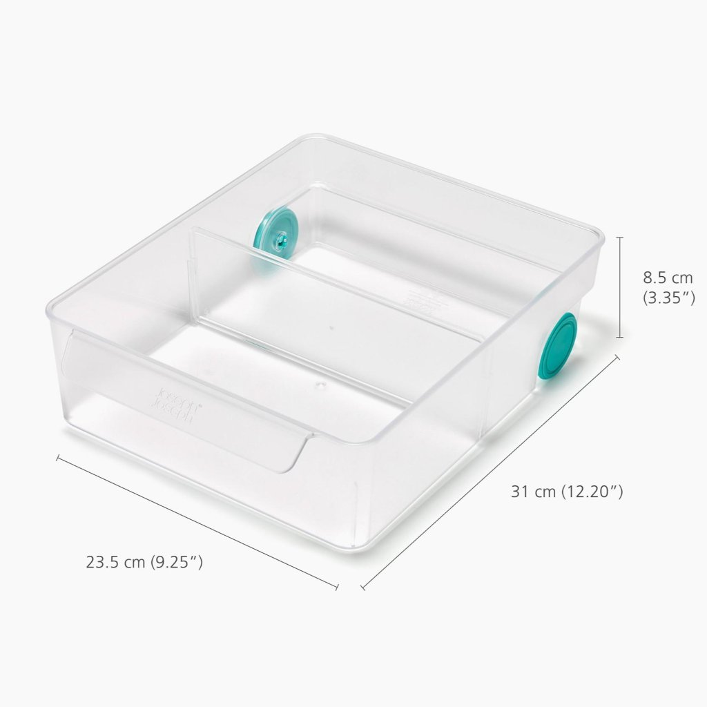- De constructie van de bak is zo ontworpen dat deze in standaard koelkasten past met een minimale plankdiepte van 31 cm.
